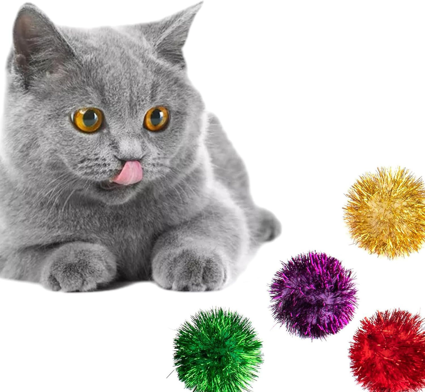 Specifications:- Size: 2inch / 5cm diameter (including sparkly tinsel)- Color: Red green purple and gold (each color of 3pcs)- Material: Sparkle tinselPackage included: 12 x Sparkle Cat Balls Notice:1. Small parts and supervise your cats when your cats playing2.Size pure manual measurement with slight error please don't mind it