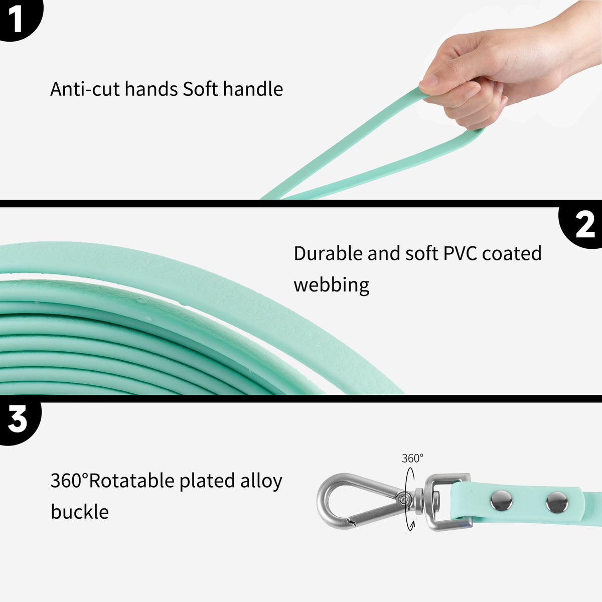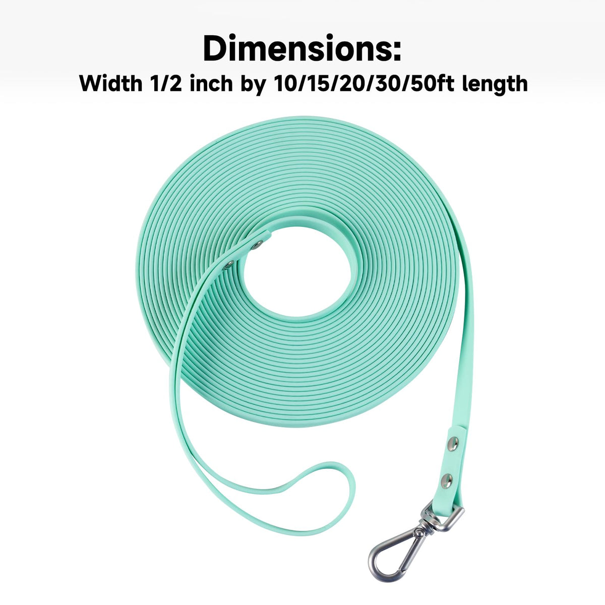 AUMAILI Dog Training Long Leash Waterproof Long Line Heavy Duty Outdoor Recall Lead 10ft 15ft 20ft 30ft 50ft for Small Medium Large Dog. Obviously any smart dog can chew through a leash. It is a lead leash, not a chew item, so keep your dog from biting it. It's great be used for dog walking and training in the great outdoors, it is specifically designed for dog training. Perfect Long Line Different Length for you choose: 1/2 inch width in length 10 ft/ 15 ft / 20ft / 30 ft / 50 ft. its great for your dog playing and have freedom in courtyard or on the beach. Waterproof Outdoor Training Leash in Nice Colors: Black, Blue, Pink, Orange and Mint Green.