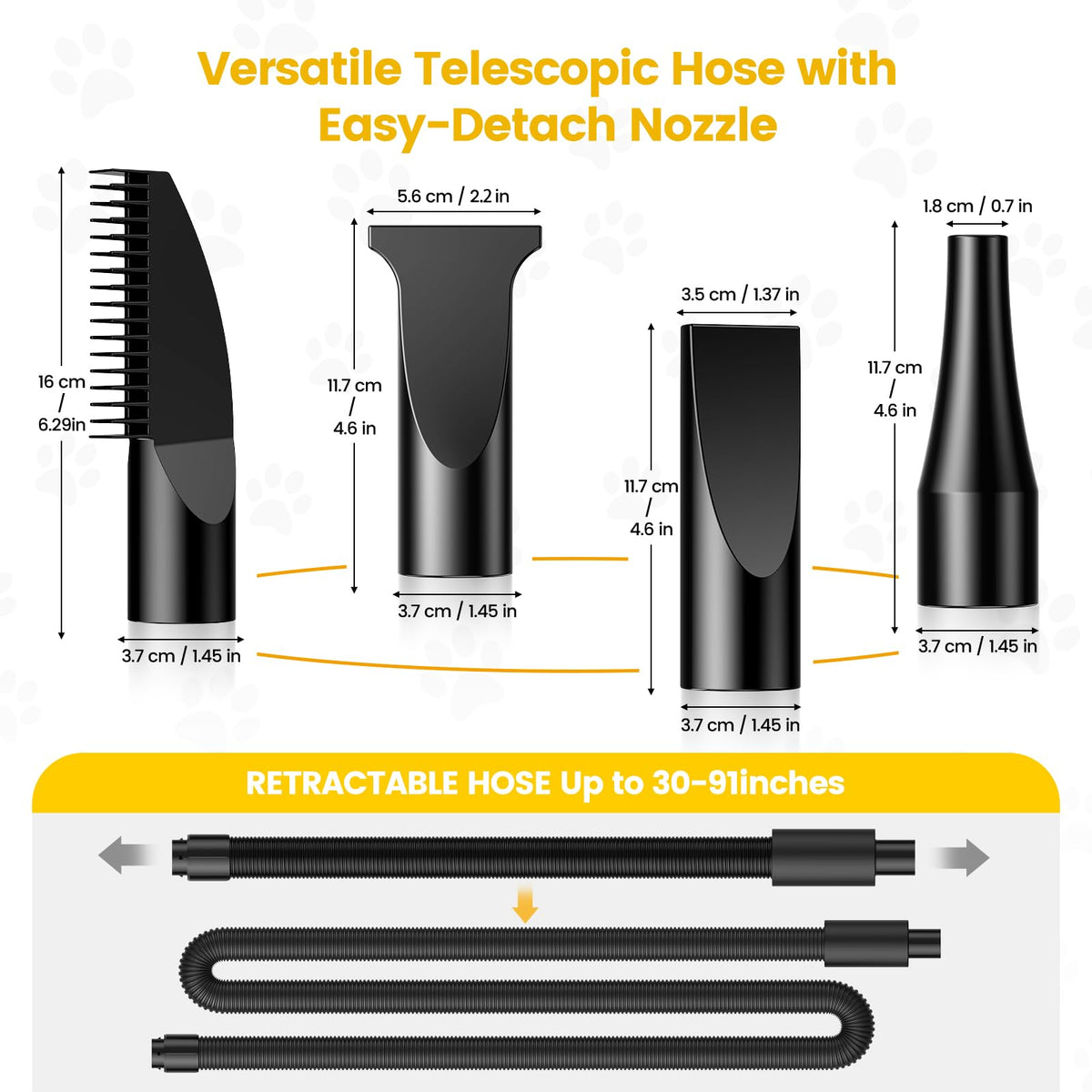 Auorc New Upgrade Pet Blower - Your Ultimate Grooming Companion Elevate Your Grooming Routine With The Auorc Pet Blower, A Powerful Tool Designed To Make Pet Care Easier And More Enjoyable. This Advanced Dryer Combines Cutting-Edge Technology With Thoughtful Features To Ensure A Seamless Experience For Both You And Your Pets. Experience Quieter Grooming Sessions Thanks To The Innovative Thickened Inner Barrel, Which Significantly Reduces Noise Levels. This Thoughtful Design Is Perfect For Pets That May Be Anxious Or Sensitive To Sound, Allowing For A More Relaxed Atmosphere During Grooming. With An Impressive 5.2Hp/3800W Motor, This Blower Delivers Rapid Drying Capabilities. It Effortlessly Tackles Thick Fur, Efficiently Removing Loose Hair And Debris, So Your Pet Looks And Feels Their Best In No Time. Customization Is At Your Fingertips With Adjustable Wind Speed And Temperature Settings. Whether You Require A Gentle Breeze Or A Powerful Blast, The Auorc Blower Accommodates Your Preferences. Plus, A Built-In Safety Mechanism Ensures The Dryer Shuts Off Automatically If Overheating Occurs, Providing Peace Of Mind During Use. The Design Prioritizes User Comfort, Featuring An Insulated Hose Handle That Allows For Easy Handling Even During Extended Sessions. The Quick-Release Mechanism Also Simplifies Nozzle Changes, Making Your Grooming Process More Efficient And Hassle-Free. Versatility Defines The Auorc Pet Blower; It'S Not Just For Pets. Use It For Drying Vehicles, Refreshing Furniture, Or Tackling Other Household Tasks. With Multiple Interchangeable Nozzles And A Heat-Resistant Hose, It Adapts To Various Needs While Delivering Stable And Reliable Performance.