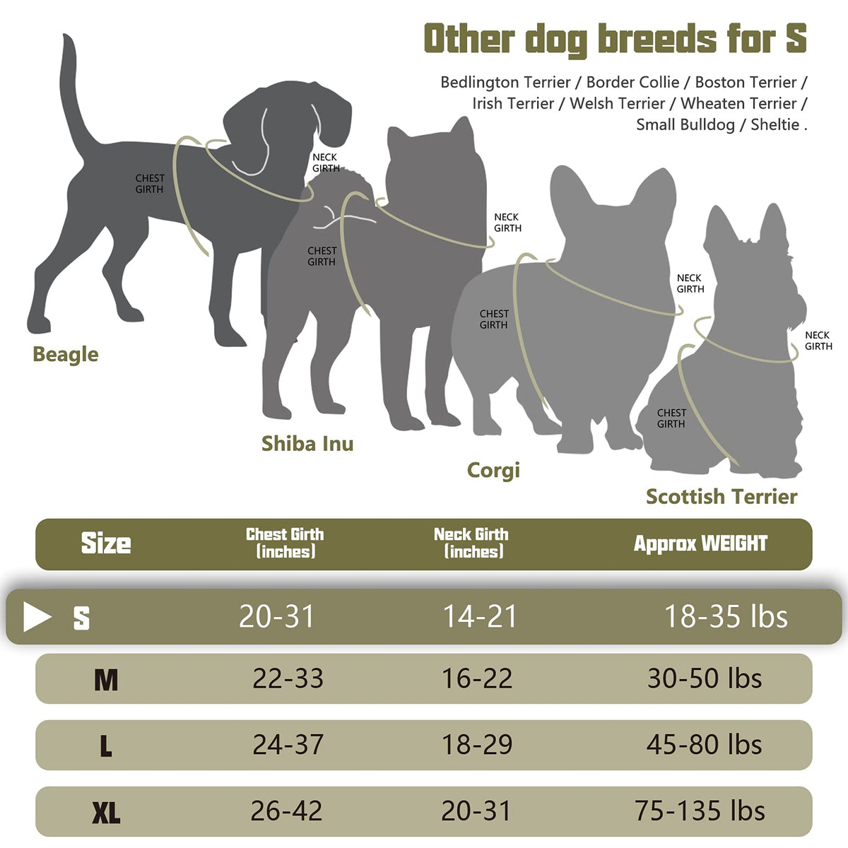 Q: What sizes are available for the AUROTH Tactical Dog Harness?A: The AUROTH Tactical Dog Harness is available in size S, with a neck measurement of 14-21 inches and a chest measurement of 20-31 inches. It is designed to provide a snug fit for small to medium dogs.