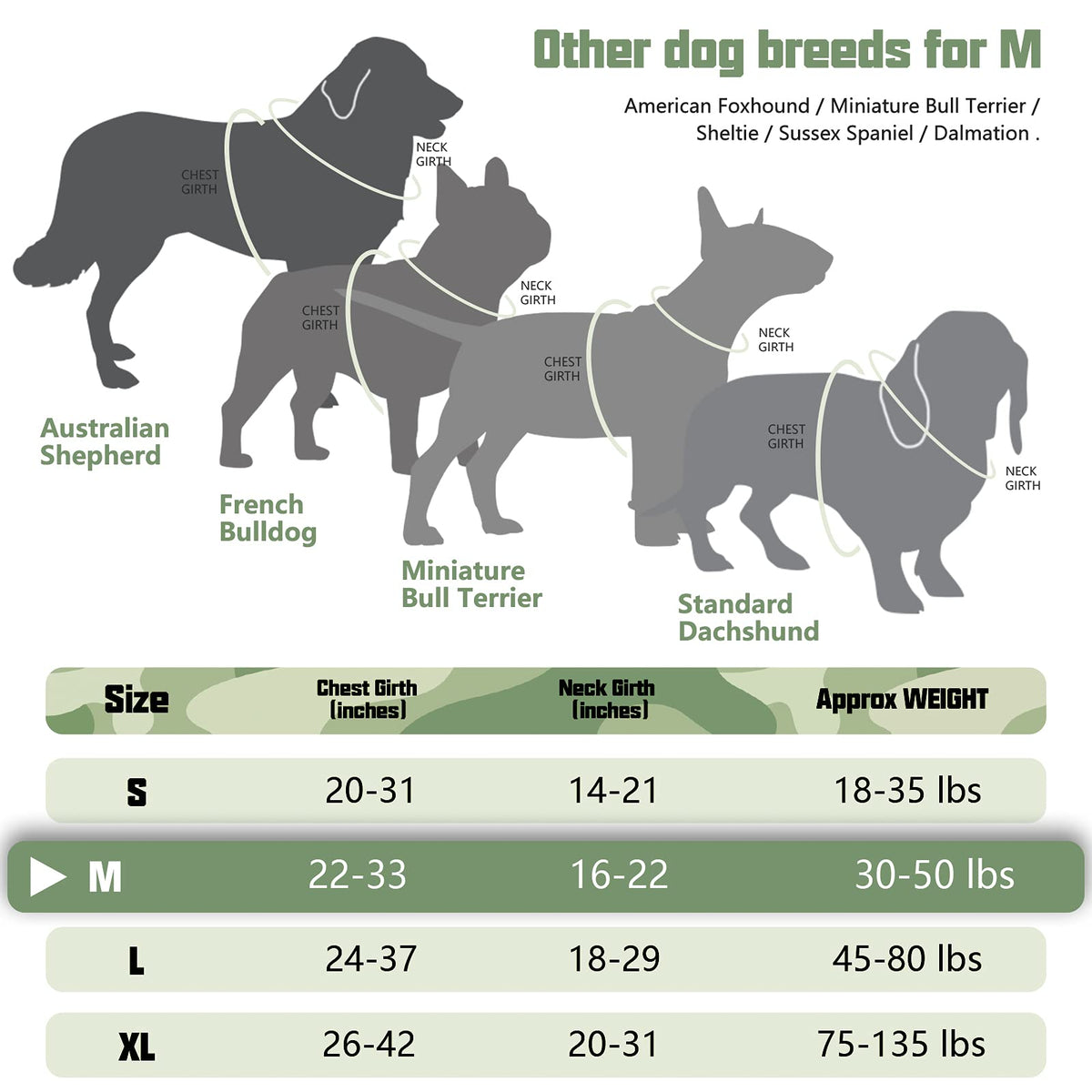 Q: What sizes does the AUROTH Tactical Dog Harness come in?A: The AUROTH Tactical Dog Harness is available in size M, which fits necks measuring 16-22 inches and chests measuring 22-33 inches. It's important to measure your dog to ensure the perfect fit.