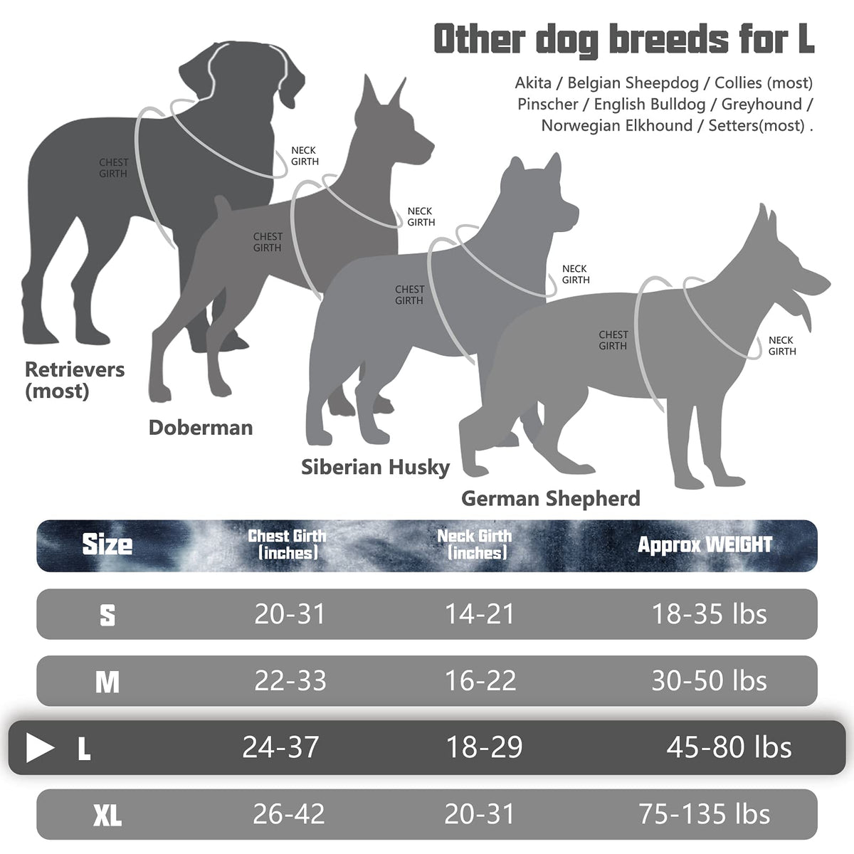 Q: What sizes are available for the AUROTH Tactical Dog Harness?A: The AUROTH Tactical Dog Harness is available in size L, which fits neck sizes from 18 to 29 inches and chest sizes from 24 to 37 inches. Be sure to check our sizing chart for the perfect fit for your dog.