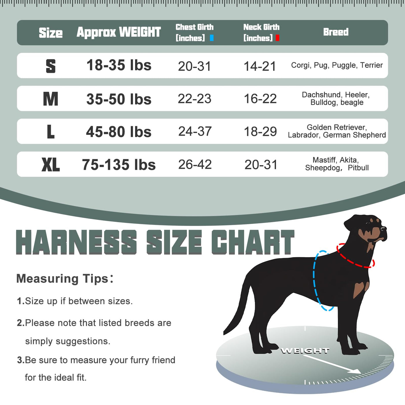 Q: What sizes are available for the Auroth Tactical Dog Harness?A: The Auroth Tactical Dog Harness is available in XL size, which fits dogs with a neck measurement of 20-31 inches and a chest measurement of 26-42 inches, suitable for dogs weighing between 75 to 135 lbs.