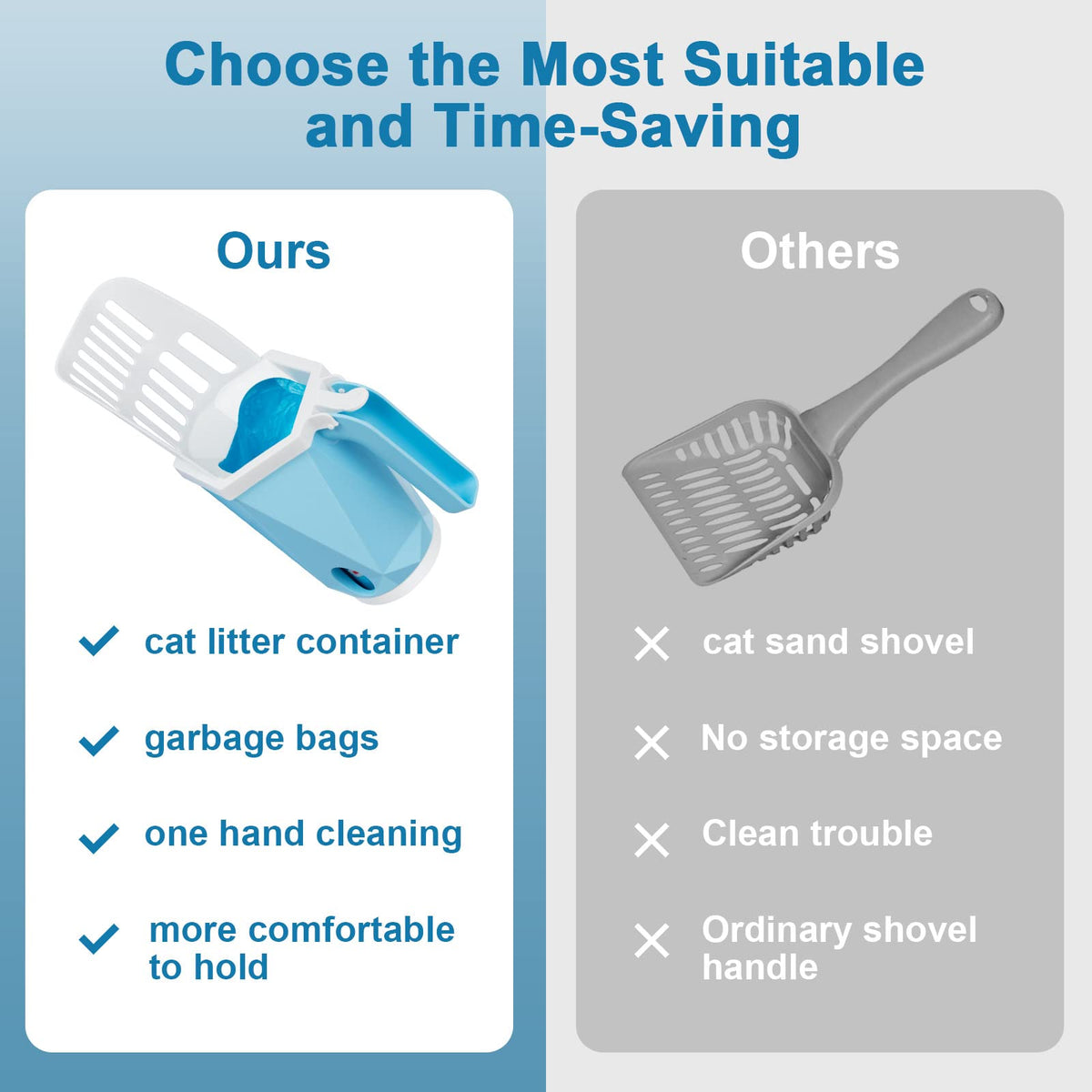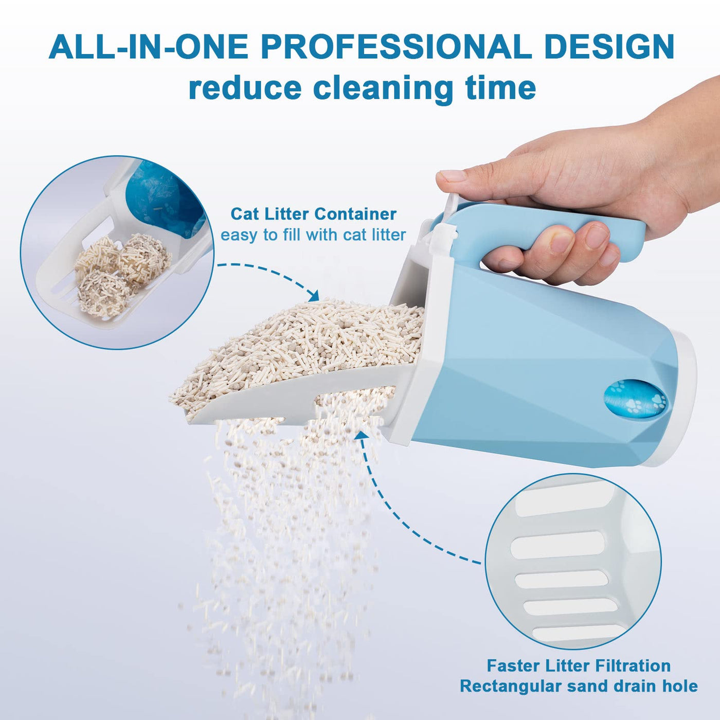 2 in 1 cat Litter Scoopcombination of cat litter scoop and litter box easy scooping and bagging faster cleaning Simple to operate with one hand no litter spills Save TimeThe cat litter scoop is equipped with a garbage bag chute so you dont have to waste time searching for litter bags saving cleaning time 10 roll BagsThe item include ten rolls of garbage bags each roll has 15 garbage bags a total of 150 count bags Meet your cleaning needs Optimal DesignOur garbage scoops are made of sturdy materials and are strong and durable The handle has a curved design to make the cleaning process more comfortable and effortless It also wont get your hands dirty Quality PromiseWe are committed to providing excellent service to every customer If you have any questions please feel free to contact us Your satisfaction is our motivation