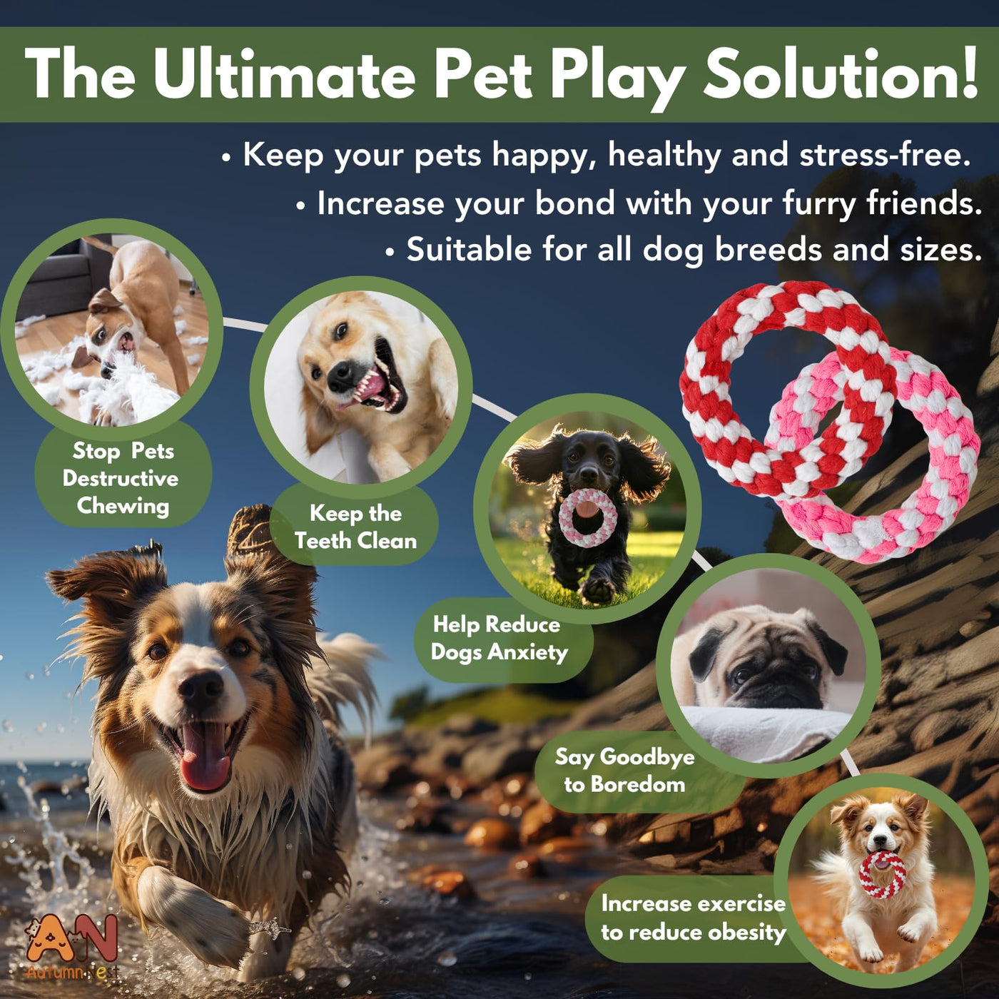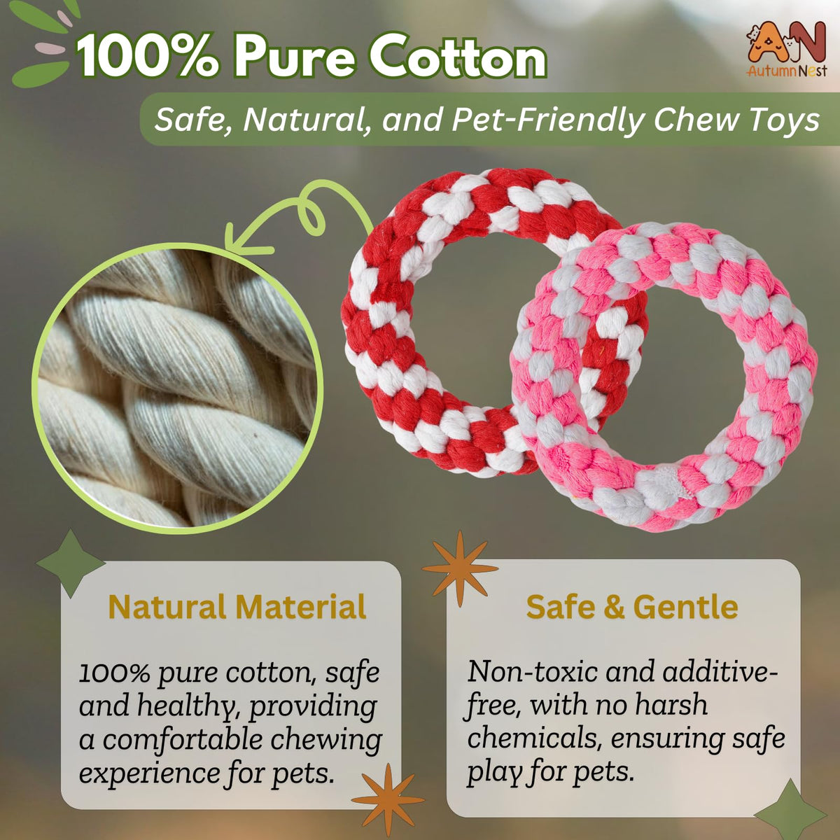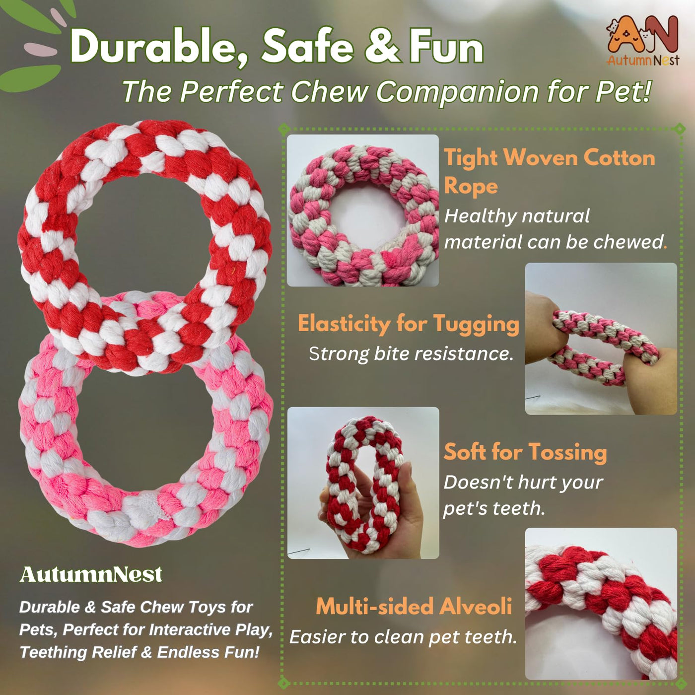 The Autumnnest Woven Round Donut Pet Rope Toys Set Includes Two Vibrant 4.8-Inch Donut-Shaped Pet Rope Toys-One In Red And One In Pink-Perfect For Your Dogs, Cats, And Other Pets. These Durable Pet Chew Toys Are Made From 100% Natural Cotton, Ensuring They Are Safe, Non-Toxic, And Gentle On Your Pets Teeth And Gums. Designed For Aggressive Chewers, These Pet Rope Toys Offer Excellent Teething Relief And Help Promote Dental Health By Cleaning Teeth, Massaging Gums, And Reducing Tartar Buildup. Whether Used For Fetch, Tug-Of-War, Or Solo Chewing, These Chew Toys For Dogs, Chew Toys For Cats, And Chew Toys For Pets Provide Hours Of Entertainment. The Vibrant Red And Pink Colors Make Them Fun And Attractive, Adding Extra Joy To Your Pets Playtime.