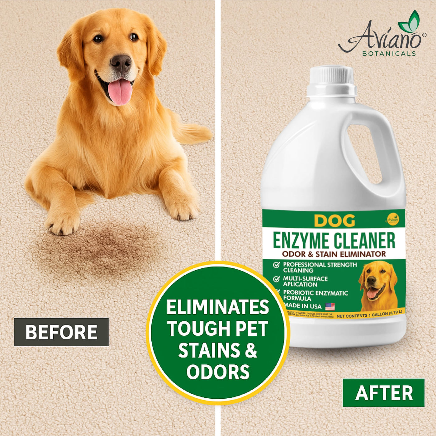 Accidents happen, but your home doesnt have to smell like it. Aviano Enzyme Cleaner for Dog Urine and Poop Carpet, tile, hardwood, furniture, bedding, and drains is an all-in-one odor and stain eliminator made for real dog owners. This powerful dog urine enzyme cleaner uses active enzymes and probiotics to break down dog pee, poop, and vomit on contact-removing the mess and neutralizing odors completely. Safe to use on: Carpet and rugs Tile, hardwood, and laminate Pet bedding and crates Furniture and upholstery Bathrooms, drains, and litter areas Whether youre training a puppy or dealing with an older dog, this product performs as a reliable dog pee enzyme cleaner , carpet stain remover for pets , enzyme pet odor remover , and more. Its also a trusted pet enzyme carpet cleaner and enzyme pet cleaner for high-traffic dog zones. Directions for Use: Carpets & Upholstery: Blot excess mess. Soak the area with product. Let sit 5-10 min. Blot and let dry. Floors: Dilute 2-5 oz per gallon of water. Mop as usual. Drains & Toilets: Pour to cup 2x per week. For strong odors, use daily until resolved. Pet Bedding or Crates: Spray thoroughly. Let sit before wiping or air drying. Septic Systems: Start with 1 pint per 25 cubic feet, then maintain weekly with 8 oz. This is the pee enzyme cleaner dogs need-no more lingering smells, just a clean, fresh home. More than just a stain remover, this formula is engineered to fully eliminate tough dog odors-leaving your home smelling clean and fresh after every use. A subtle, natural lemon scent adds a light, pleasant finish without overpowering perfumes.