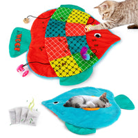 Q: Does the AWOOF Cat Mat help with my pet's anxiety?A: Yes, the AWOOF Cat Mat features hidden toy pockets filled with catnip and various toys, which can help reduce boredom and separation anxiety for your pets, providing them with interactive playtime.