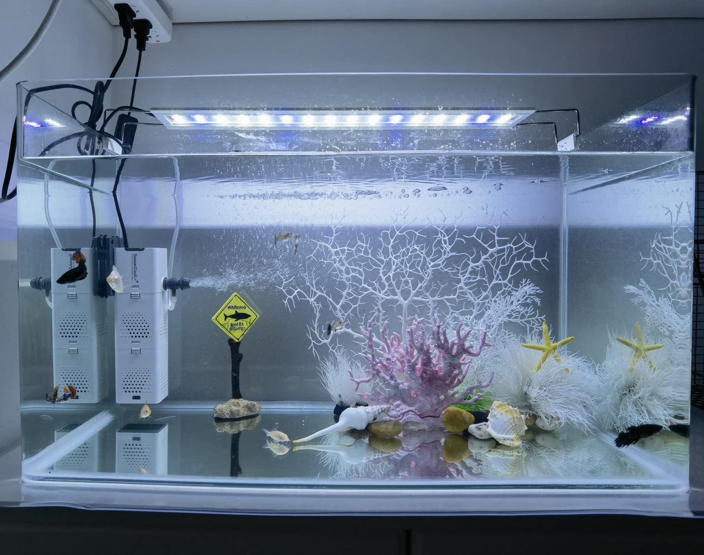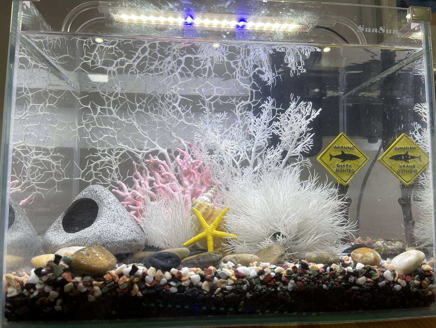Q: How many decorations are included in the AWXZOM set?A: The AWXZOM set includes a total of 10 pieces, featuring a variety of decorations such as coral trees, a shark road sign, starfish, and pseudoplants. This diverse selection allows you to create a beautiful and dynamic aquarium layout.