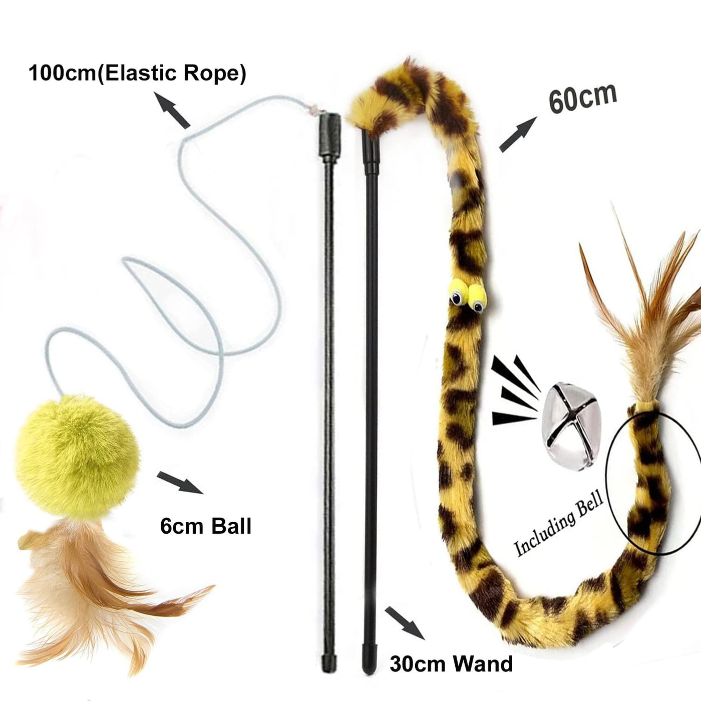 Q: How do the cat wand toys engage my cat during playtime?A: The cat wand toys are designed with bright, vivid colors and include bells inside the plush balls. This combination captures your cat's attention, encouraging them to chase and interact with the toys, promoting exercise and play.