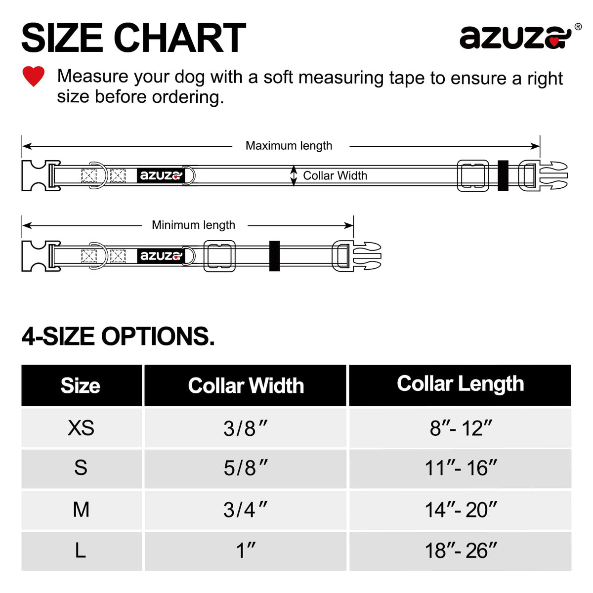 Q: What sizes do the azuza dog collars come in?A: The azuza dog collars are available in four sizes, including extra small (XS) which fits necks measuring 8" to 12". This variety ensures a comfortable fit for small, medium, and large dogs.