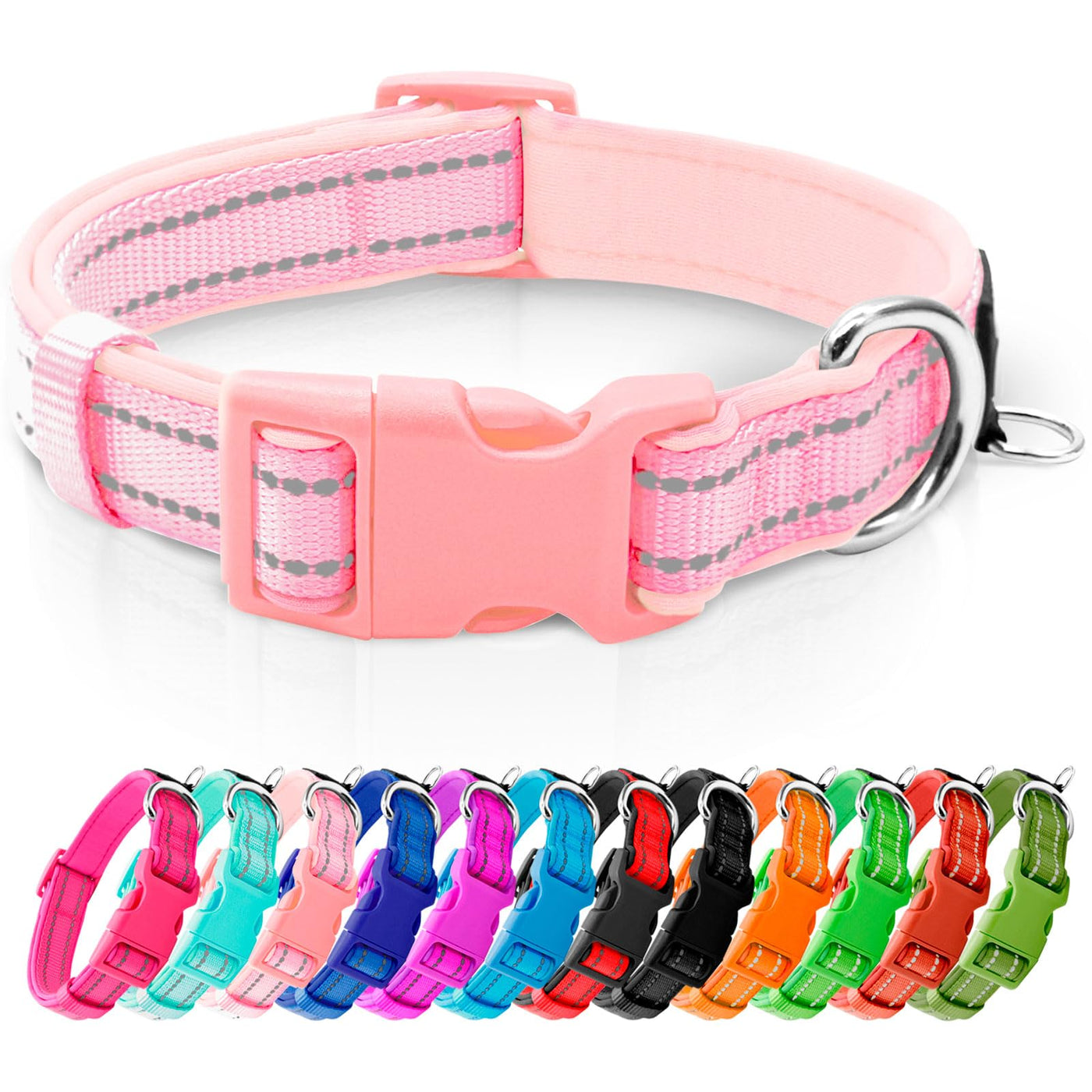 Reflective Strap:Dog collar with high-quality reflective threads for extra visibility from distance at night Neoprene Padded:Soft and breathable padded dog collar with high density nylon webbing comfy for dogs to wear for a long time Accessories:Premium ABS made buckle with variable trendy color options fashion look in dog and good taste for the ownerThe metal D ring is chrome coated to add durabilityDog colalr is convenient to adjust put on and take off Smart ID Ring:azuza dog collar is designed with an extra ID tag ring for the purpose of attaching dog charms tags pendants or accessories Size:X-Small Width 58 Neck Size 8-12 Small Width 34 Neck Size 10-16 Medium Width 1 Neck Size 14-20 Large Width 1 Neck Size 16-40