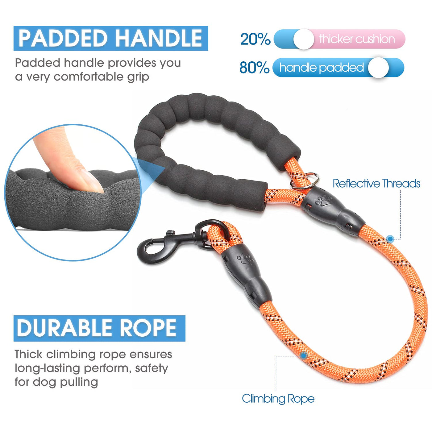 [1] Durable climbing rope Maximum toughness; [2] Comfortable soft padded handles; [3] Highly reflective threads for night safe; [4] Amazing customer services; [5] Reasonable price!