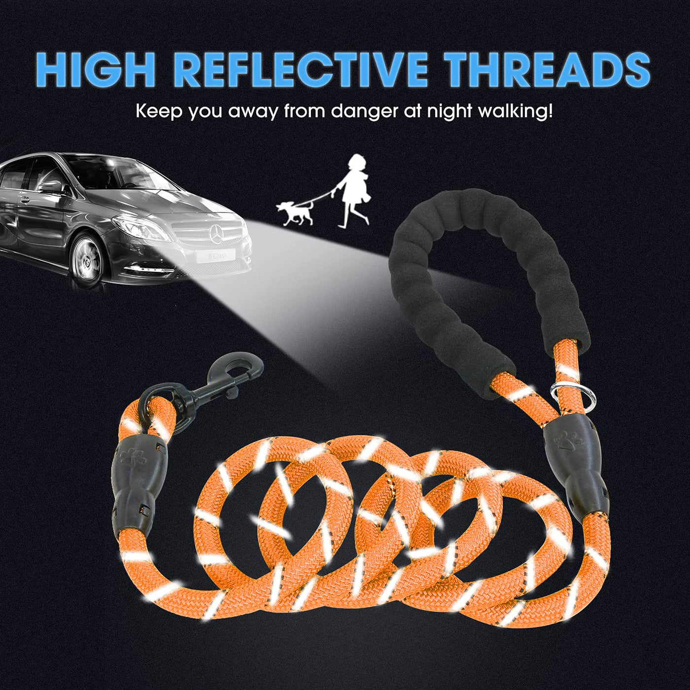 Q: How does the reflective threading enhance safety during night walks?A: The highly reflective threads woven into the leash enhance visibility in low-light conditions, providing added safety for both you and your dog during nighttime walks.