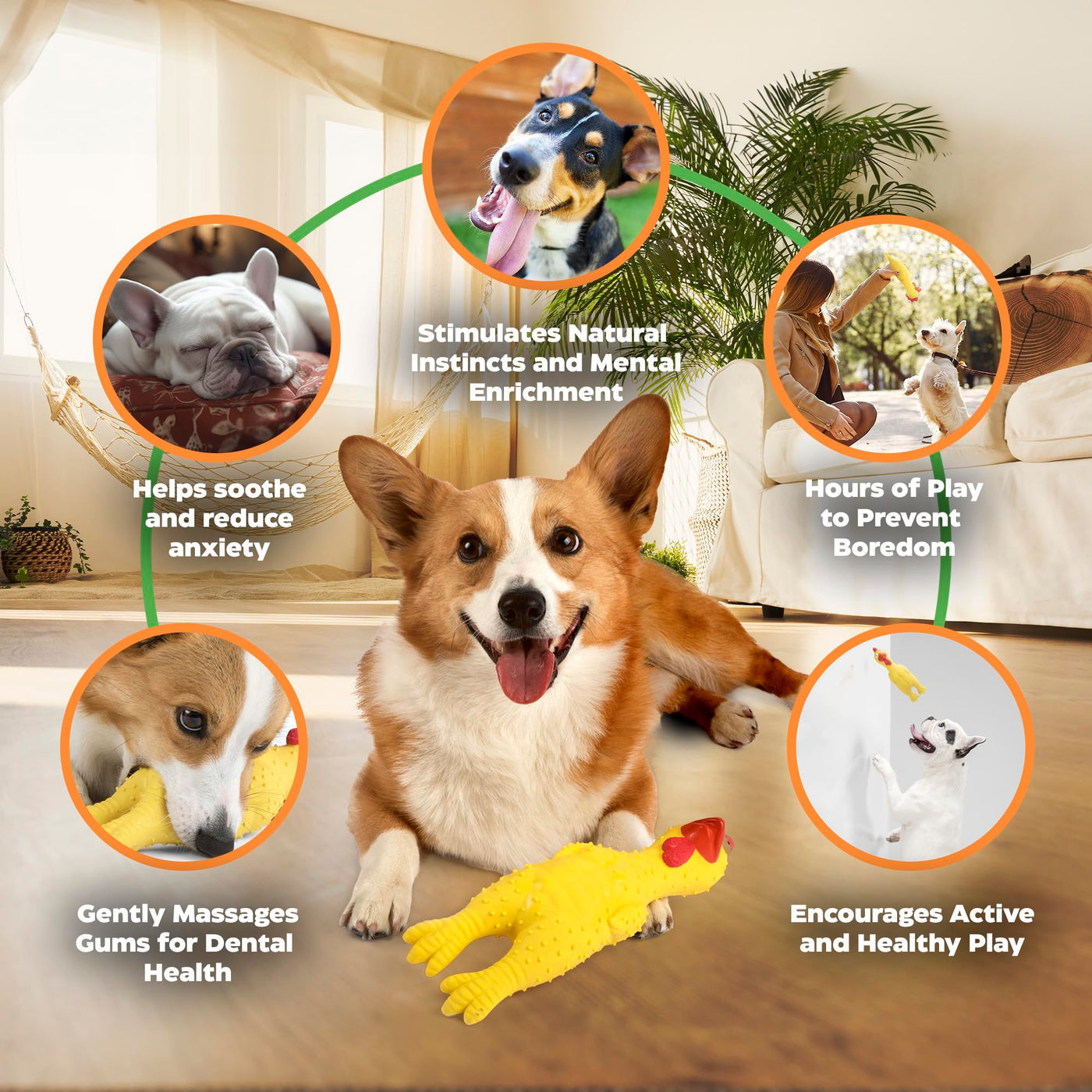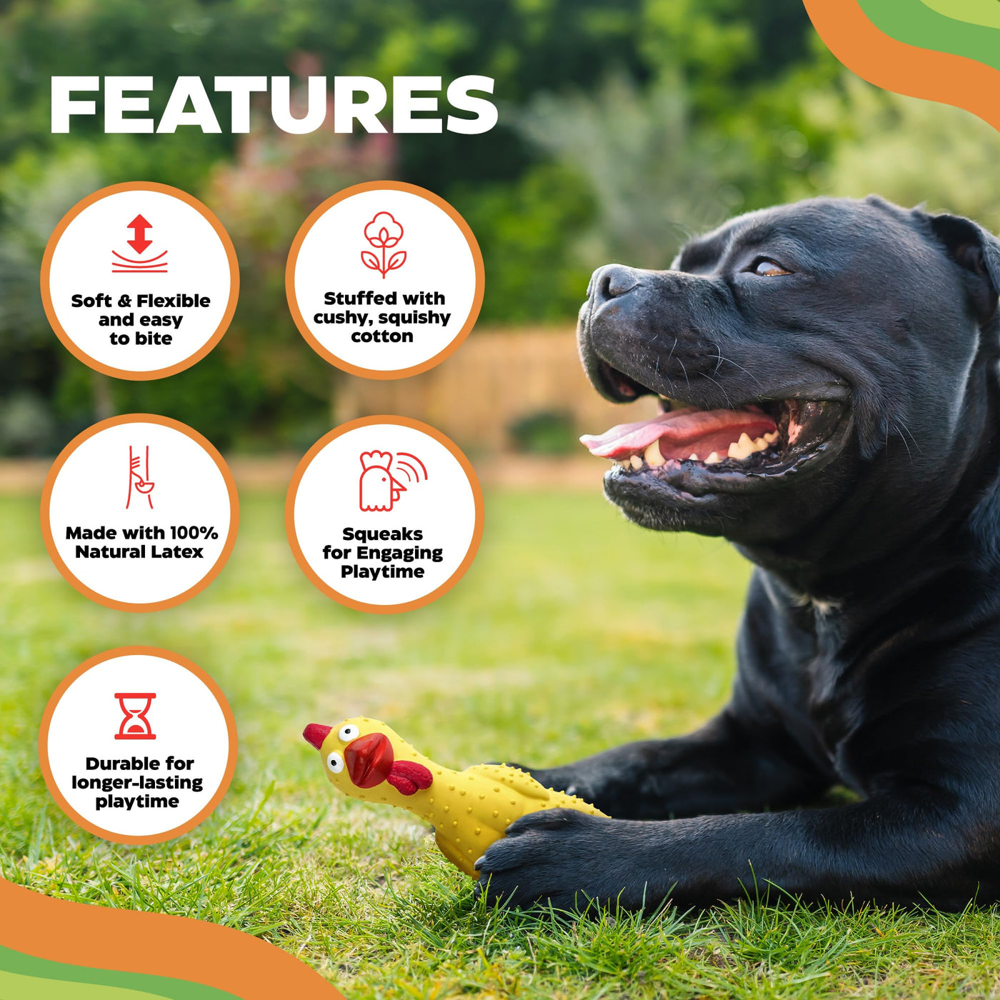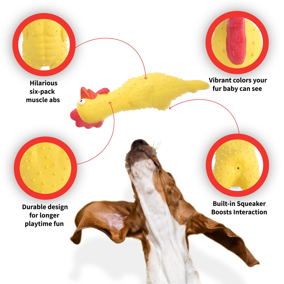 Meet Playtime's Best Friend-our Latex Muscle Chicken Dog Toy! This rubber chicken dog toy isnt just another toy; its a funny dog toy designed to deliver hours of entertainment. Made with 100% natural latex, non-toxic dog toy, this interactive dog toy is built for long-lasting durability and fun. Whether youre looking for dog toys for large dogs, medium dogs, or small breeds, this squeaky dog toy is the perfect fit for all sizes. If your dog loves to chew, fetch, or engage in active play, this toy will quickly become their favorite. Plus, its bright colors and hilarious mohawk design make it easy to spot, whether indoors or outdoors. Why choose our Latex Muscle Chicken Dog Toy? It stands out with its playful design, featuring a mohawk and six-pack abs. This chicken dog toy is not just a source of amusement for your dog but also a conversation starter for you! Watch your dog proudly parade this toy around, knowing its as much fun for them as it is for you. Crafted with thicker walls than most rubber dog toys, this tough dog toy is designed to withstand heavy play, especially for aggressive chewers. Unlike many rubber chickens that squeak, our toy is built to last, ensuring it can take the pressure of dog toys for large dogs without wearing out too quickly. Its not just tough, though-its designed for interactive play, so your dog will stay engaged during playtime. Whether your dog prefers squeaky, chewy, or simply funny dog toys, this screaming chicken toy fits the bill. The loud squeaker inside this toy is more than just a sound-its a call to play! If your dog loves squeaky dog toys, theyll fall in love with this one. The high-pitched squeak is perfect for keeping your dog active and entertained, making it one of the best dog enrichment toys available. This toy also helps alleviate boredom and provides mental stimulation, making it a top choice among mentally stimulating toys for dogs. The squeaker is built for durability, making it one of the longest-lasting dog squeaky toys on the market. Measuring 11 x 3 1/2 inches, this dog toy for large dogs is ideal for all breeds. Whether youre looking for small dog toys or large dog chew toys, this versatile chicken toy will keep your dog entertained, no matter their size. Its lightweight yet strong enough to withstand the rough play of aggressive chewers. Perfect for indoor and outdoor use, this toy is a staple in any dogs collection of interactive dog toys for large dogs or small breeds. The fun doesnt stop there-this toys design is one of a kind. With its mohawk and six-pack abs, this crazy chicken dog toy is bound to bring joy to your dog and a smile to your face. Its bright colors make it highly visible, even in the yard, and its sturdy construction means it will last far longer than most rubber squeaky dog toys. Whether youre playing fetch or your dog is simply chewing away, this toy is the ultimate playmate for any dog. Why settle for ordinary dog toys when you can give your pet something extraordinary? Our Latex Muscle Chicken Dog Toy is more than just a chicken squeaky toy-its the ultimate dog toy for keeping your dog engaged, active, and entertained. Whether your dog is a gentle chewer or a tough player, this rubber chicken squeaky toy will quickly become their favorite companion, providing hours of fun and interaction. Add this unique rubber chicken dog toy squeak to your collection of toys for dogs today, and see why its fast becoming a favorite among both dogs and their owners. With a combination of durability, entertainment, and humor, its the perfect addition to any dogs toy box. Dont wait-give your dog the gift of play with this must-have toy today!