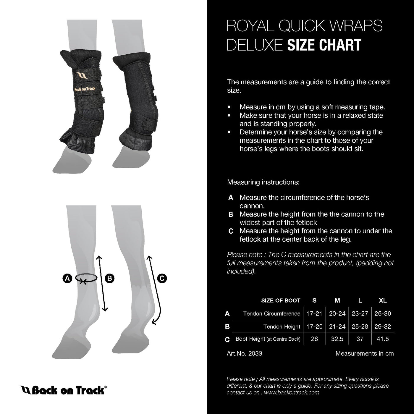 Q: What size should I choose for my horse?A: The Back on Track Royal Quick Wraps Deluxe are available in various sizes including Medium. It is important to measure your horse's legs to ensure a proper fit, as an accurate fit will maximize support and comfort.