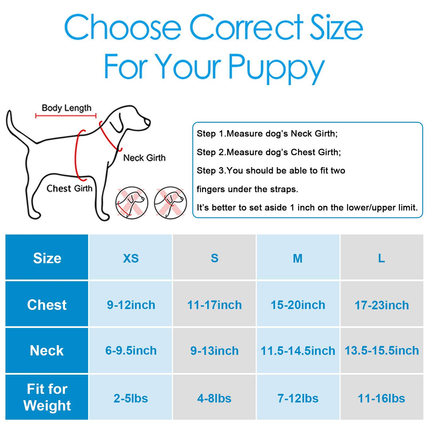 Q: What sizes are available for the Bark Lover Small Puppy Harness?A: The Bark Lover Small Puppy Harness is available in four sizes: XSMALL (7"-9" Neck, 10"-12" Chest Girth), SMALL (10"-13.5" Neck, 13"-18" Chest Girth), MEDIUM (11.5"-14.5" Neck, 15"-20" Chest Girth), and LARGE (13.5"-15.5" Neck, 17"-23" Chest Girth). Be sure to measure your pet's neck and chest before ordering to ensure a snug fit.