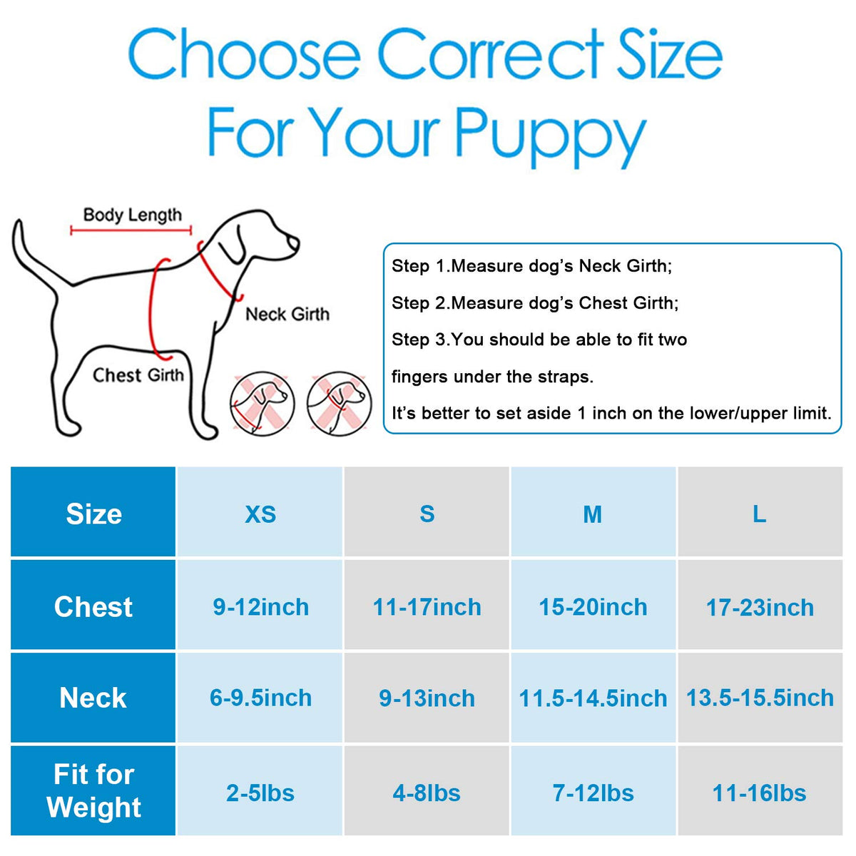 XSMALL – 7'-9' Neck, 10'-12' Chest Girth, Fit for weight 2-5 pounds SMALL –10'-13.5' Neck, 13'-18' Chest Girth, Fit for weight 4-8 pounds MEDIUM –11.5'-14.5' Neck, 15'-20' Chest Girth, Fit for weight 8-12 pounds LARGE –13.5”-15.5” Neck, 17'-23' Chest Girth, Fit for weight 11-16 pounds