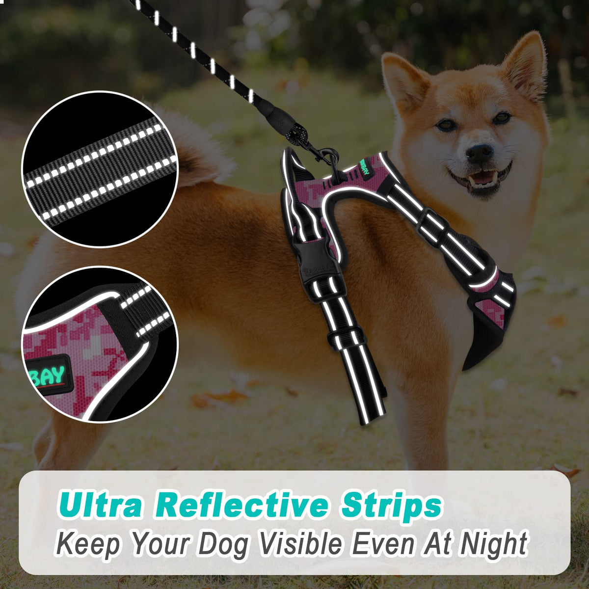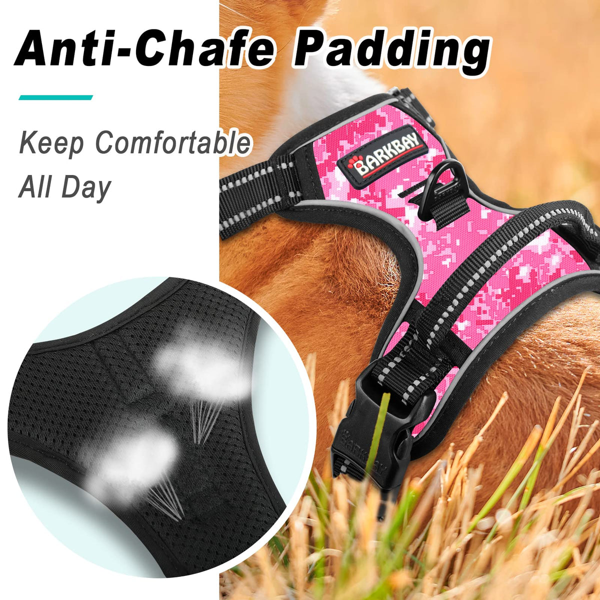 Designed for Everyday Dog Harness with a Handle for Control The BARKBAY No pull dog Harness is an everyday harness that is easy to put on and comfortable for dogs to wear. It eliminates pressure from your dog's neck and prevents possible neck, spine, and wind pipe injuries. Even if your dog is not a puller, he/she could be injured wearing a collar if he/she makes a quick move to chase a squirrel, dog, or person. Also have the Sturdy Handle on the back can easily control dog when you training Easy to Put on and Off with HASSLE-FREE and Comfortable This Easy Control BARKBAY Harness is designed to slip over your dog’s head and secure at the sides, making it easy to gear up and get out there. It offers 4 points of adjustment that allows you to create a customizable fit specifically for your dog, allowing he/she for full range of motion. Reflective thread&Quality material Seams of luminous reflective stitching that run the length of the straps and the back front harness to make sure you puppy is safe and visible at night. Stylish, Durable,Scratch-Resistant Oxford material outer layer. Light weighted buckle with large loading capacity greatly improves the tensile strength. Comfortable light weighted mesh lining with soft sponge padding in chest and belly. 2 Sturdy Metal Leash Attachment Points O-ring on the chest up front for more control when your pup's still training, and D-ring on the back for more relaxed walks. rose fuchsia watermelon flamingo strawberry taffy bubblegum magenta hot