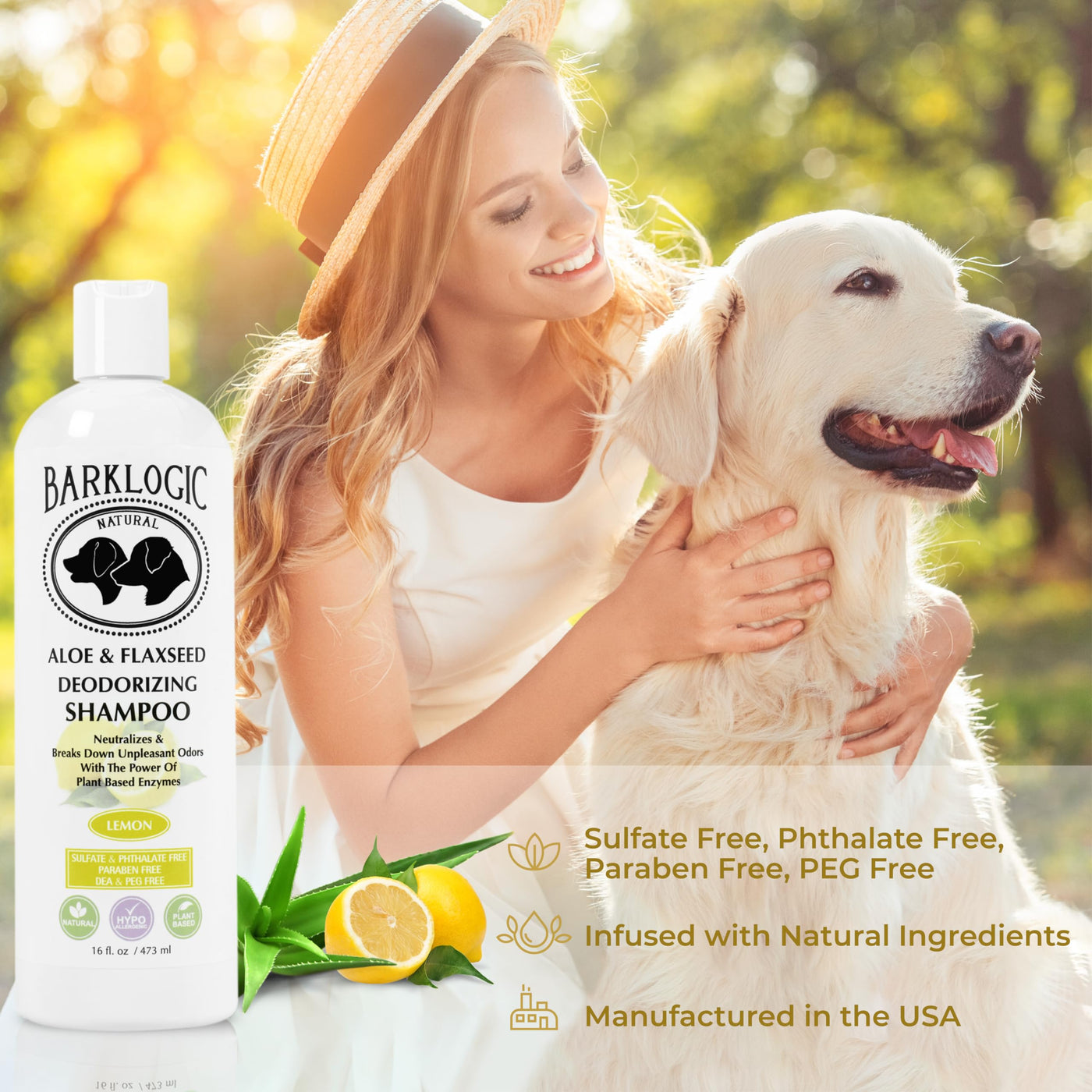 Barklogic Aloe & Flaxseed Naturally Derived Dog Deodorizing Shampoo Is Infused With Plant Based Enzymes To Break Down Unpleasant Odors On Your Dog. This Naturally Derived Dog Shampoo Is Puppy Safe Too, And Infused With Lemon Essential Oil To Refresh And Detoxify, Leaving A Shiny Coat Behind. If You Have A Smelly Dog, This Lemon Dog Shampoo Is The Formula For You! All Barklogic Products Are Vegan And Made In The U.S.A.