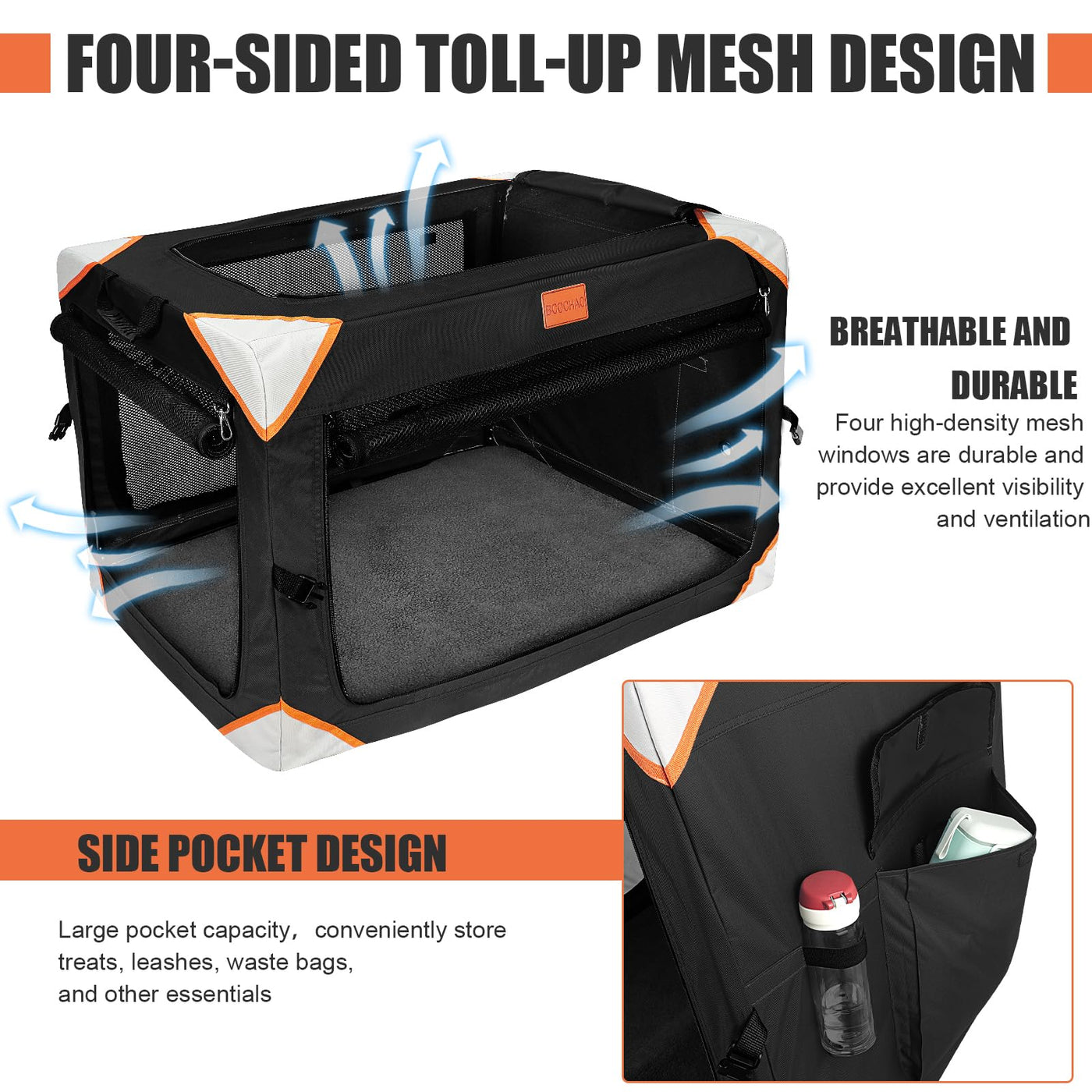 Designed For Traveling: This Soft-Sided Crate Features A Foldable Construction Frame That Can Be Easily Folded Into An Extra Compact Package. It Comes With A Convenient Storage Bag, Allowing You To Carry It Effortlessly On Your Outings And Travels. The Quick Assembly In Just 1 Minutes And Easy Disassembly Make It A Hassle-Free Choice For Your Adventures. Breathable & Comfortable: The Four-Side Zippered Breathable Mesh Walls Ensure Optimal Ventilation, Providing A Comfortable Environment For Your Furry Friend. The Soft Plush Mat Inside The Crate Offers A Cozy And Comfortable Space For Them To Relax And Unwind. Enhanced Safety: With A Heavy-Duty Iron Frame, This Crate Maintains Its Shape And Ensures Durability. Reflective Strips On Both Sides Enhance Visibility, Keeping Your Pet Safe And Visible. The Crate Is Equipped With Self-Locking Zippers, Preventing Your Pet From Escaping, While High-Density Durable Mesh Adds An Extra Layer Of Security. Additionally, An Built-In Leash Further Reinforces Your Pet'S Safety. Easy Assembly, Storage, & Maintenance: The Convenient And Simple Design Allows For Quick Assembly Within 1 Minutes. The Crate Can Be Folded Into Two Different Ways, Catering To Various Indoor And Outdoor Settings. It Features A Water Resistant Design With Waterproof Fabric, Making It Easy To Clean With Just A Damp Cloth. The Removable And Machine Washable Mat Simplifies Care. Various Sizes For All Breeds: This Crate Is Available In Four Sizes To Accommodate Different Breeds And Sizes Of Pets. Choose From S (Up To 35Lbs), M (Up To 50Lbs), L (Up To 70Lbs), And Xl (Up To 90Lbs) To Find The Perfect Fit For Your Furry Companion.