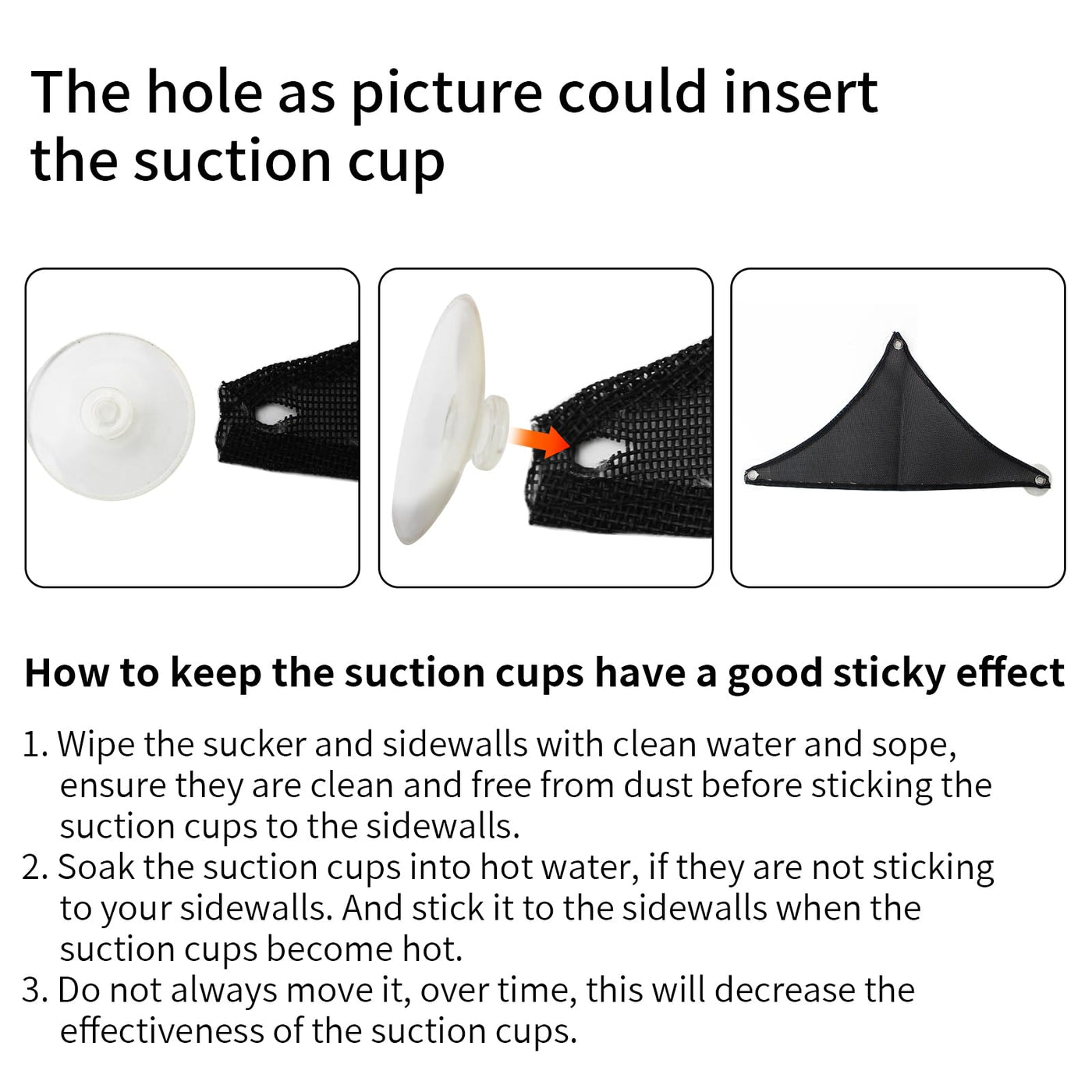 Q: How do I properly attach the hammock using suction cups?A: To ensure a secure attachment, clean the suction cups and the surface of your tank with water and soap to remove dust. For better adhesion, soak the suction cups in hot water before sticking them to the sidewalls. Avoid frequently repositioning them to maintain their effectiveness.