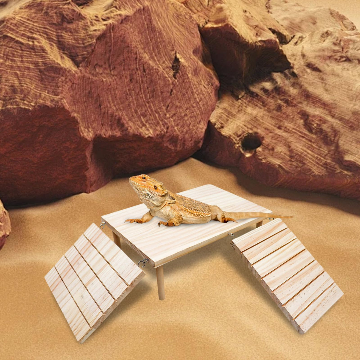 Enhance your reptiles habitat with this versatile bearded dragon basking platform and wooden cave hideout. Crafted from high-quality materials, this multi-functional accessory provides a secure hiding spot and an elevated basking area with a ramp for easy access. Perfect for bearded dragons, leopard geckos, lizards, turtles, and even hamsters, this platform offers a naturalistic touch to aquariums and terrariums. Encourage your pets instinctive behaviors while promoting exercise and enrichment. With its durable construction and space-saving design, this basking platform is a must-have addition to any reptile or small pet enclosure.