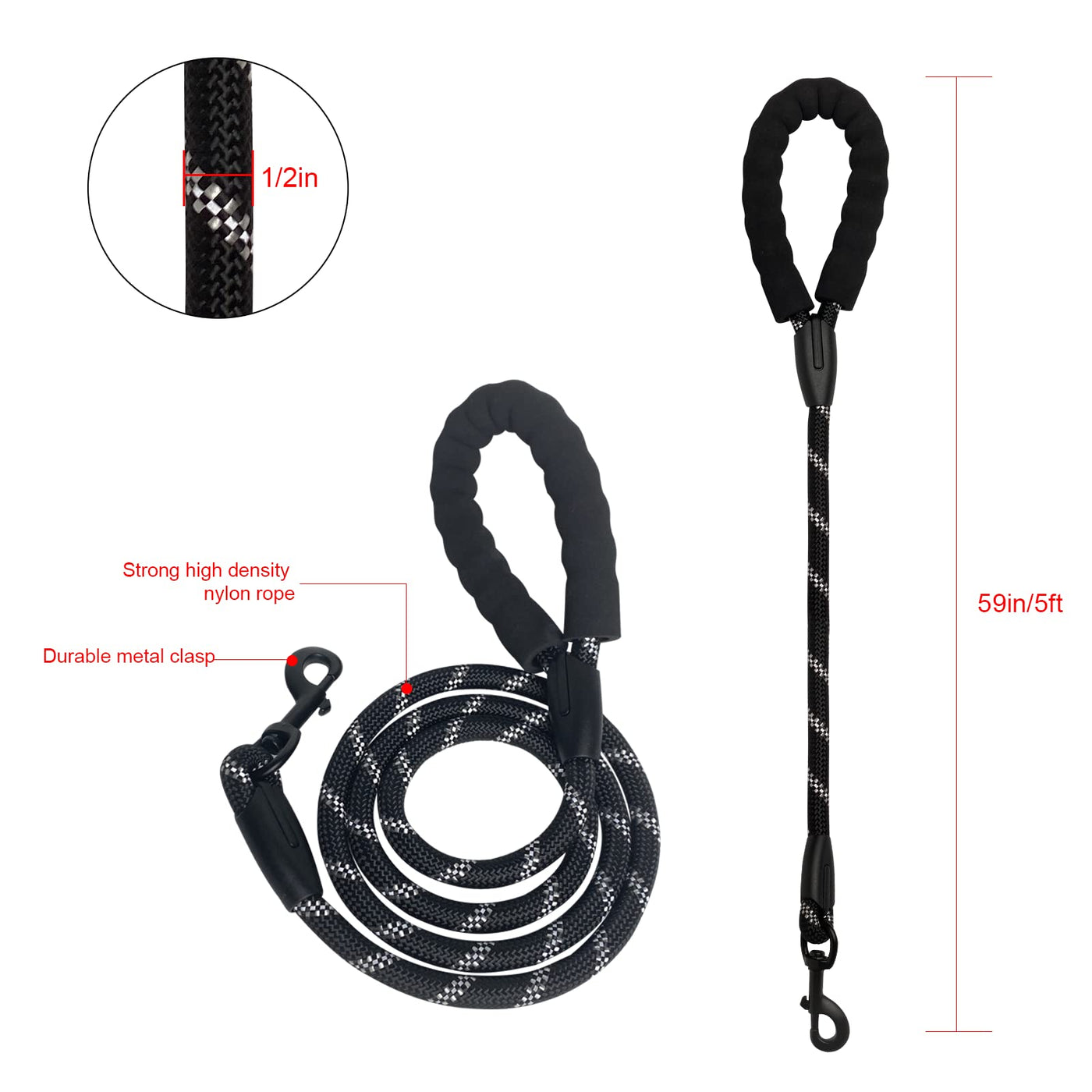 Beastron 5Ft Heavy Duty Dog Leash With Comfortable Padded Handle And Highly Reflective Threads For Medium And Large Dog’S, Black