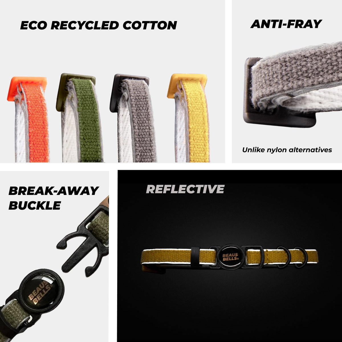 Keep Your Cat Safe And Comfortable With This Eco-Friendly Reflective Collar. Made From Breathable Recycled Cotton, It Features A Break-Away Buckle, Anti-Fray Durability, And A Water-Repellent Coating. Double D-Rings Allow Extra Tags, While Reflective Strips Enhance Night Visibility. Designed For Safety, Style, And Sustainability. See Fitting Guide For Sizing.