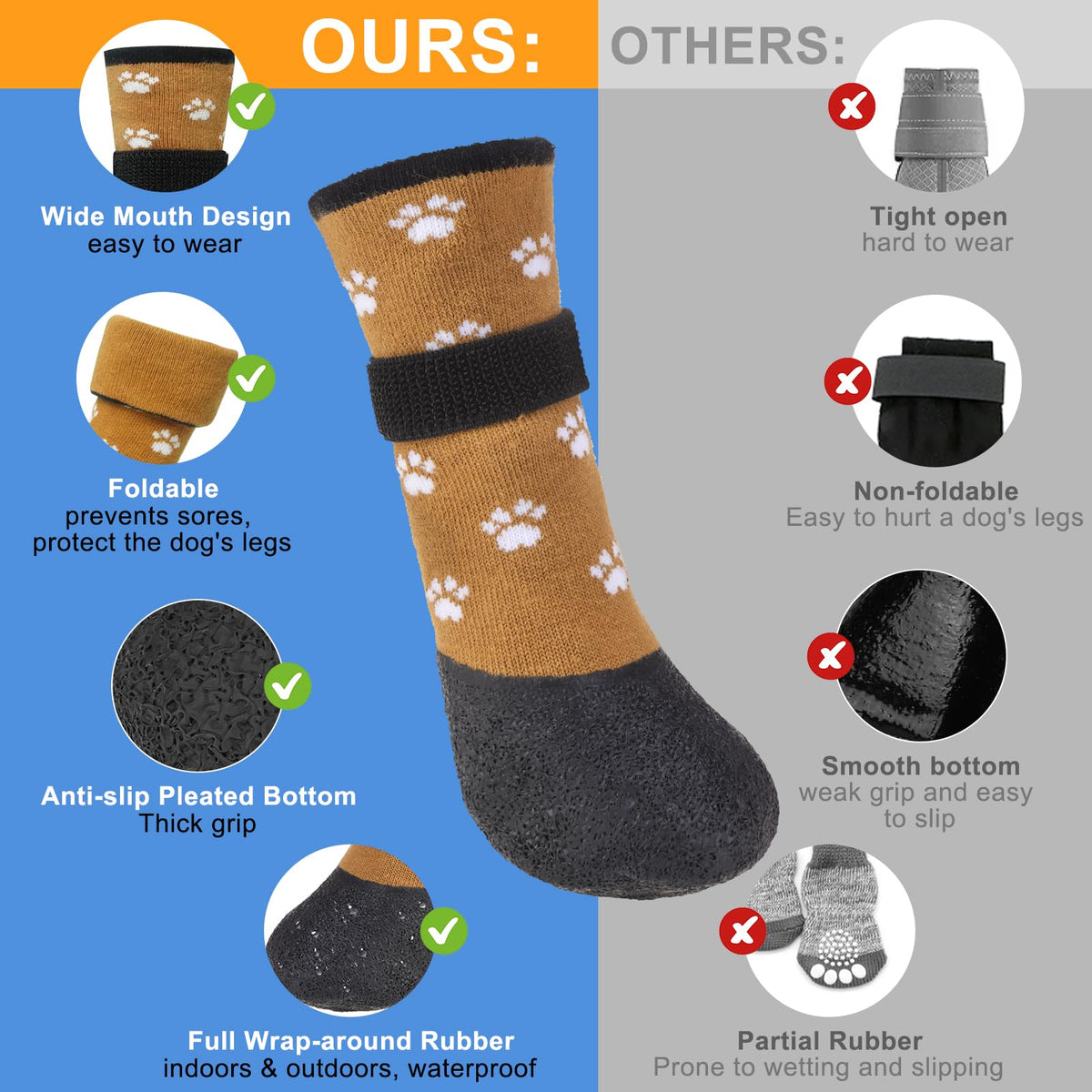 ANTI-SLIP & WATERPROOF: Our dog boots are surrounded on all sides by a pleated durable rubber underneath which provides a stronger grip and is more slip resistant. Our pet paw protector socks are very friendly to both puppies and older dogs. These anti-slip dog socks can be worn as dog boots on wooden floors indoors and outdoors.