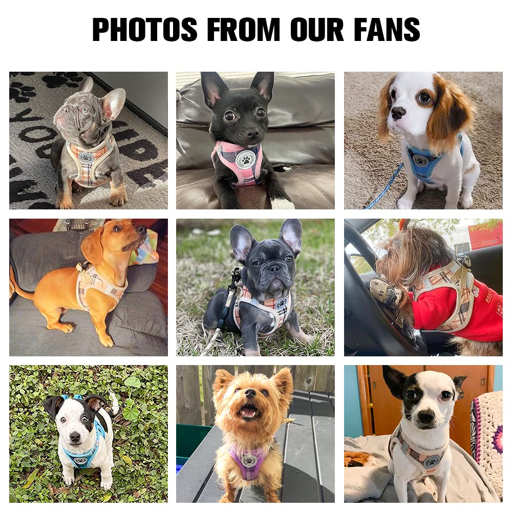 Small Dog Harness and Leash---chest girth 145 - 16 Leash Dia: 03 (08cM) Length: 5FT (150cM) The thickness of the leash fit for small dogs and puppies light and easy to handle Our halter is escape-proof with correct sizing and snug fit NOTE: Sizing does NOT directly correspond to your pets breed or weight Pls MEASURE your pets chest (full part) girth before purchase If in between sizes please order one size up feel free to contact us if you have any questions about the size No Pull No choke Dog Harness---The double fixing method of hook and loop fastener and buckle the sturdy double D ring provides you with two choices of traction for safer dog walks its vest-like design distributes the pressure of the leash evenly across the chest and shoulders to prevent choking or neck strain perfect for dog training or dogs who tend to pull comfortable and Reflective ---Adjustable dog harness features colorful plaid and breathable mesh fabric comfortable to wear and will not stick to the dogs hair Reflective strips deign reflect ambient light in low light conditions making you and your dog safer when walking and moving around at night without worrying about blurred vision in the dark Easy on and Lightweight---STEP IN cLIP & gO Effortlessly slip this easy-to-wear vest harness on and off your puppy in seconds 1) Put the pets front legs in the step-in harness 2) Lift the small dog harness and lock the buckle 3) Adjust the chest size and clip leash on the D ring Now lets have a walking with your pet dog Padded Handle for comfort---Dog Leash is made of strong high density nylon rope and the heavy-duty 360A swivel metal hook ensures no tangle The padded handle makes it much more comfortable to hold and wrap around your hand Luminous reflective threading keeps you both safe and visible on your late-evening walks can be individually used with your other harnesses