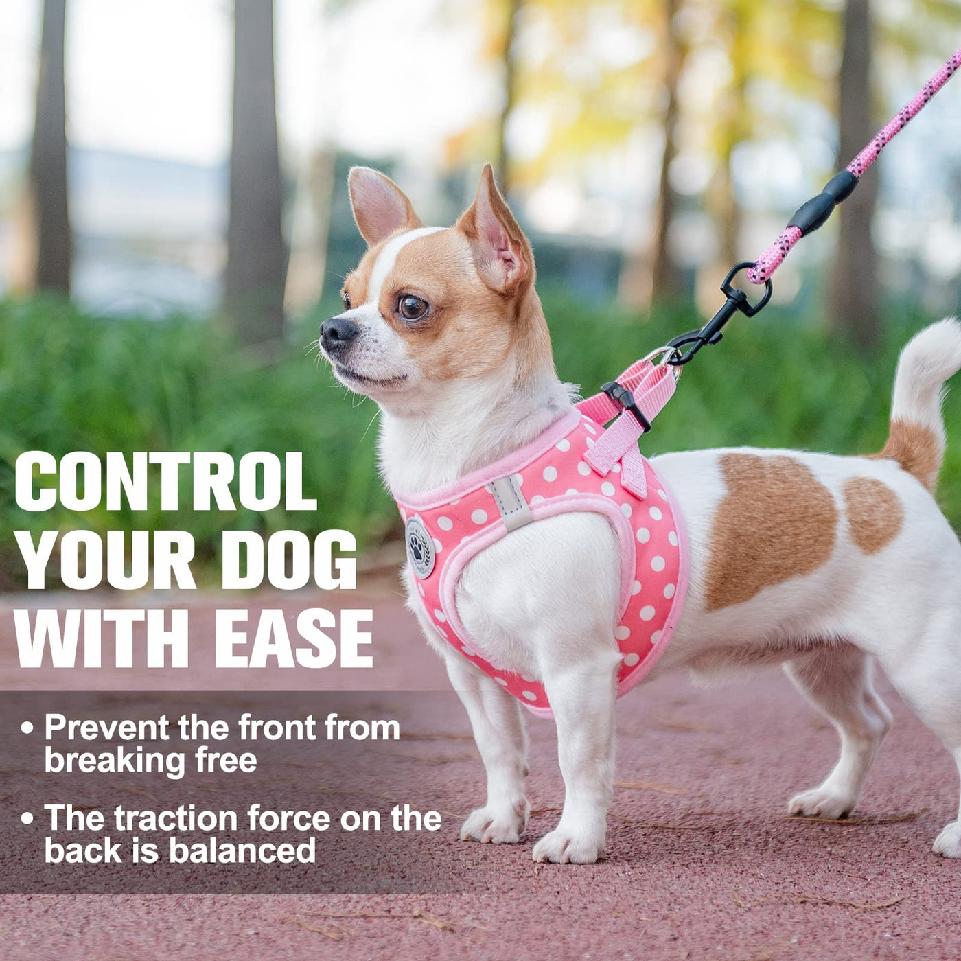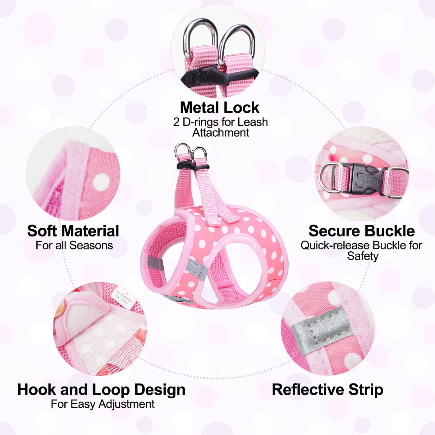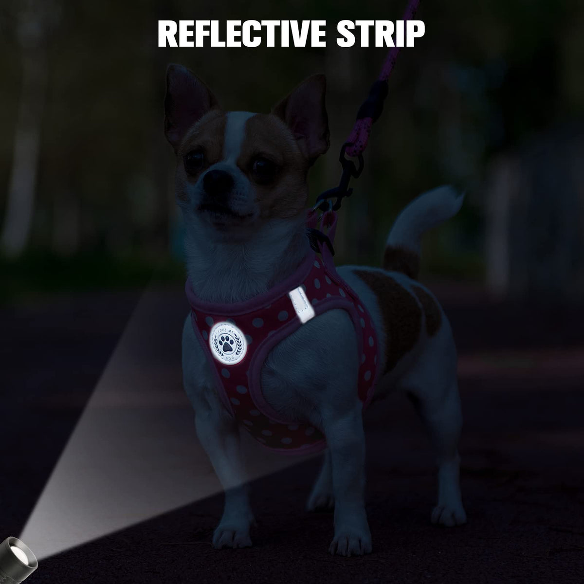 Polka Dot Dog Harness and Leash Set: Machine washable Harness for small dogs and cats has 3 sizes: XXS XS S is precisely tailored and can perfectly fit the dogs body suitable for different dog types Size Small- chest girth 145 - 16 Leash Dia: 03 (08cM) Length: 5FT (150cM) Please check the size chart information carefully If in between sizes please order NEXT SIZE which has room for growth Padded Dog Vest Harness: Our dog harnesses are made of 35%cotton 65%polyester which is lightweight and breathable soft edges that will not dig into or scratch the dogs skin and hair comfy to wear At the same time the metal material of the small dog harness and leash set is sturdy and durable will not fade and deform will not rust when exposed to water and has a longer service life Reflective Dog Harness: With premium reflective bands on the sides this adjustable dog harness can be seen even in low visibility conditions or dark night making it easier to control dogs and ensuring the safety of walking at night Plus 5ft long leash with reflective stripes also gives your dog&cat enough space to walk in front of you better control Escape Proof No-Pull Dog Harness: With a step-in design it is easy to put on or take off the puppy harness in just a few steps Simply Step in Wrap and Buckle for a secure fit The heavy duty buckle fastens securely to keep the dog walking harness closed while playing ideal for walking jogging hiking training etc Pet owners will love this pet harness Nylon Dog Leash with Padded Handle: Super cost-effective you dont need to buy an extra dog leash 360A rustproof swivel hook prevents the leash from twisting and dog getting tangled comfortable cushion padded to the handshaking part to prevent the hand from being injured due to excessive tension Refunds or Replacement contact us if you have any questions