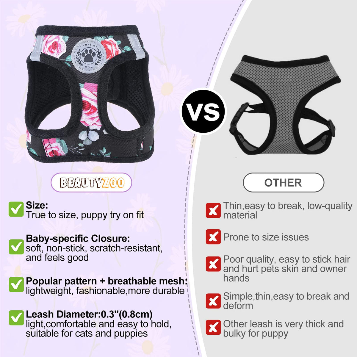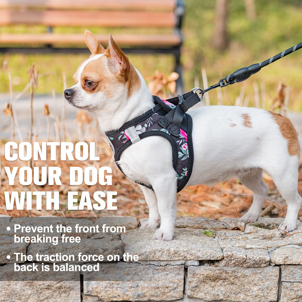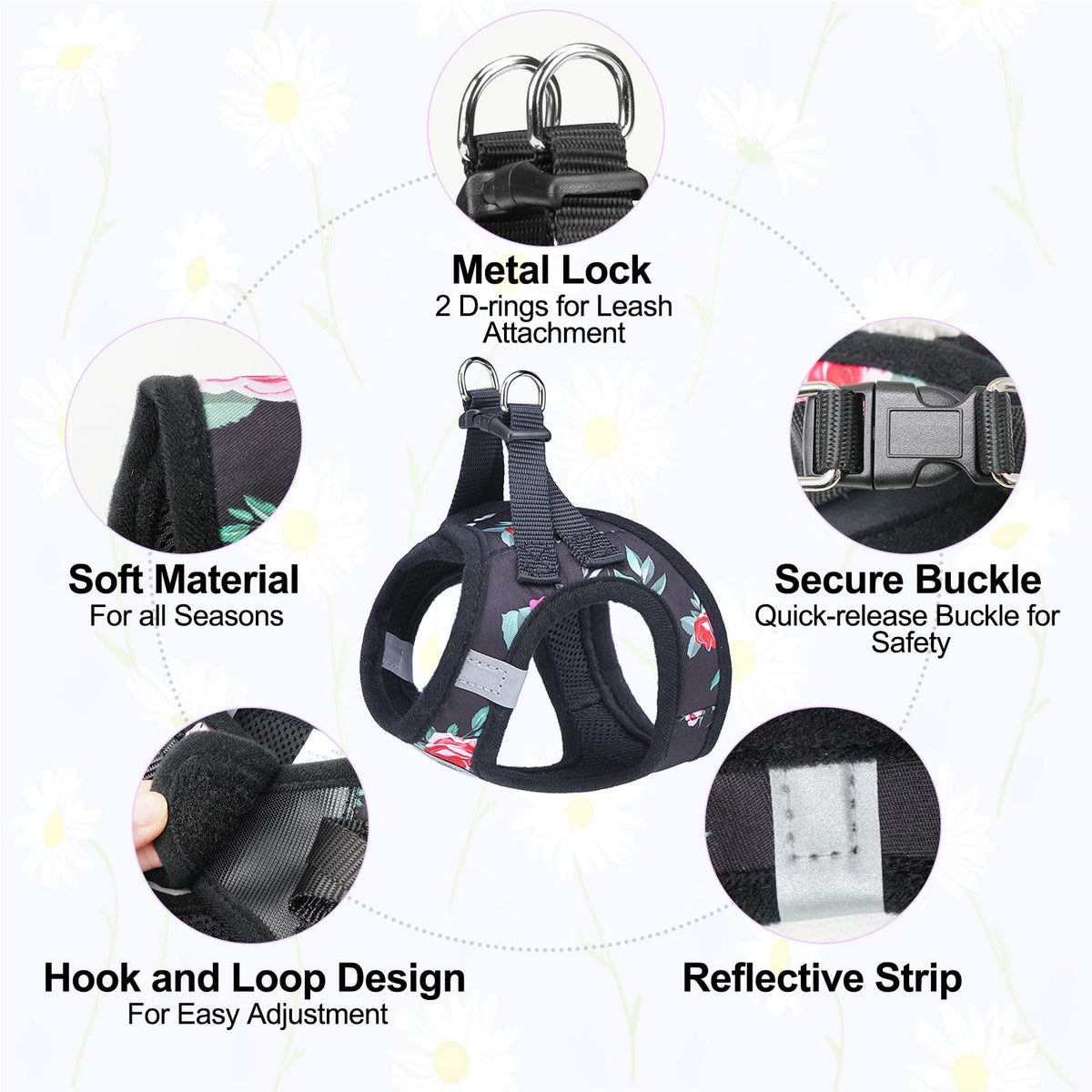 Beautyzoo Step In Dog Leash Set, Floral Pattern Reflective Harness No Pull No Choke Puppy Harness For Xxs Xs S Pets, Soft Padded