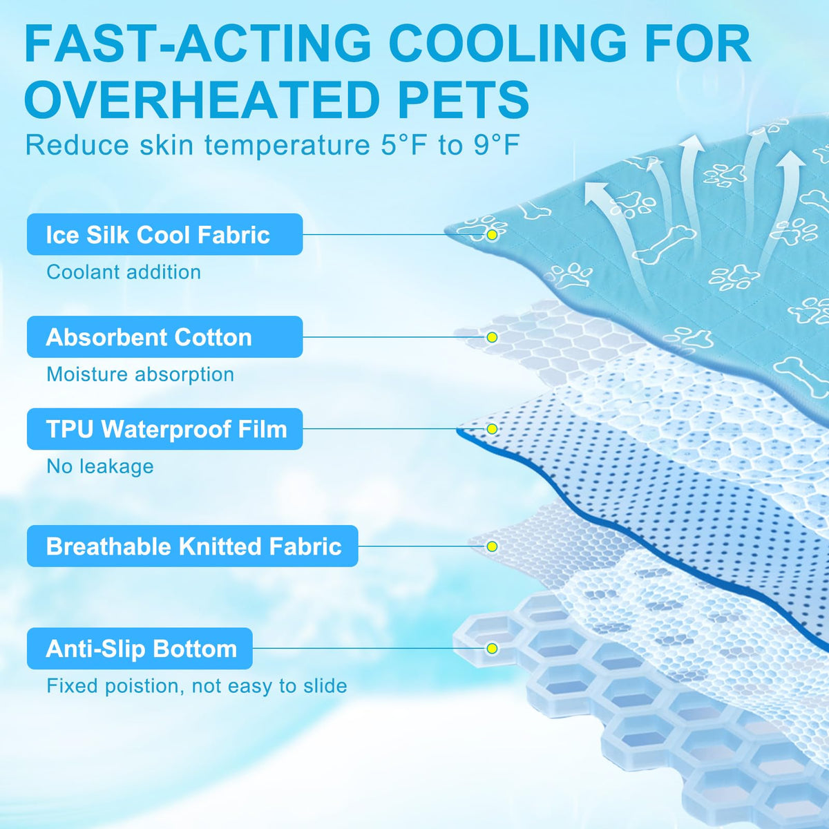 et cooling cushion Mat Pad in Size XL -- The x-large size measures 28 * 47 in and comes individually packaged making it a convenient option for pet owners with large breeds weighing less than 135 pounds The dog cooling mat provides a fun spot for your furry friend to play and relax during the hot summer months while keeping them cool and comfortable Plus with our hassle-free refund or replacement policy you can feel confident in your purchase ual Effect cool comfort-- The cooling mat for dogs and cats is made with Updated Ice Silk Fabric and coolants which will effectively lower the temperature Non-irritating fibers and without chemicals can work without refrigeration water or electricity cool but not cold keeps all your animals adults and kids healthy and comfortable even in the hottest most humid conditions Elaborate Design-- The inner layer of the mat had water absorption material to stay dry urine and odor control Besides our summer dog sleeping pad is extremely breathable and less prone to mold and bacteria growth Excellent craftsmanship can ensure self-cooling pet mat is durable enough and chew proof Our pet cooling mat also could be used as a pet pee pad or feeding mat Anti - slip & Easy clean-- Designed with non-slip dispensing bottom prevent from sliding on the floor also perfect for older animals or those dealing with joint pain or recovering from surgery Our pet mat is machine washable you dont need to spend a lot of time on pet fur and dander just throw it to the washing machine ortable & Multiple Use-- Our ice silk blanket with cute pet claw and bone pattern is lightweight and folds easily to storage or carry making it perfect for indoors outdoors in the shade and when you travel Use it in the dogs beds crates kennels couches floors the back seat of your car or a pillow seat cushion or computer cooling pad