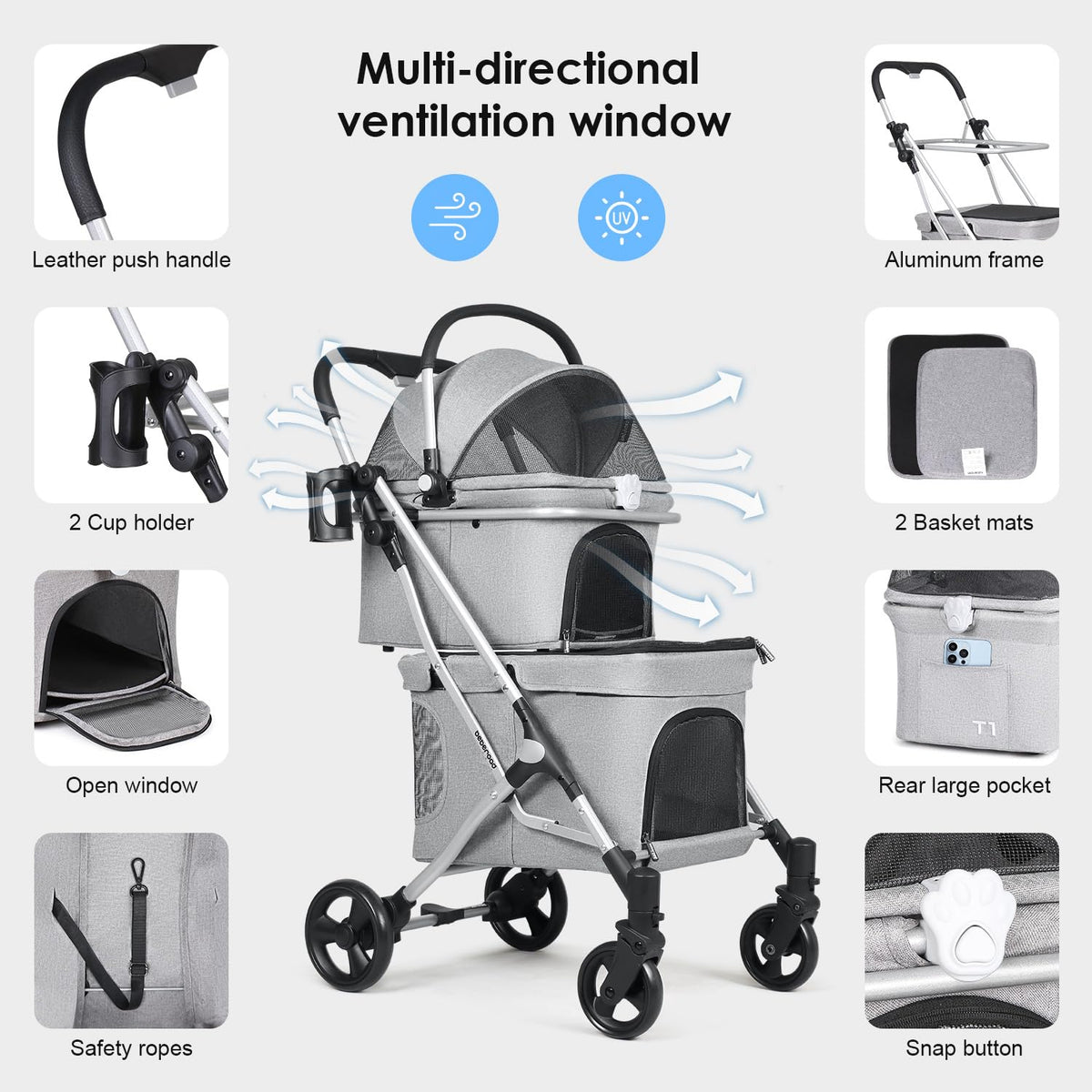 Beberoad Pets T1 Double Pet Stroller For 2 Small Dogs Or Cats Lightweight Foldable Double Cat Stroller With Detachable Carrier (