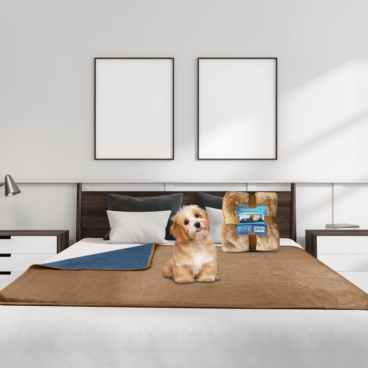 This waterproof dog blanket for bed & couch is a large beige brown throw blanket of 60x80” size, the same size as a queen size bed, and is large enough to cover a queen, double or a twin bed, or a couch sofa. A gorgeous waterproof blanket for dogs that is an essential item for dog owners for your pet hair resistant bedding if you have a pet, no matter a large, medium or small dog or cat. This couch blanket can also be used as a warm blanket or a winter blanket because it is windproof. This water proof flannel couch blanket can prevent any liquid from ruining your couch, sofa or bed, and can be used in bedding that repels pet hair and blocks liquids and moisture. Key Benefits: 1) Versatile waterproof blanket for bed & couch, an essential item for pet owners who have a dog or cat; 2) Machine washable and easy to clean; 3) Double sided & reversible absorbent blanket that looks and feels like a regular flannel blanket but is waterproof and stain proof, because this bed blanket is made with a waterproof TPU film sandwiched between 2 layers of fuzzy flannel fabric.