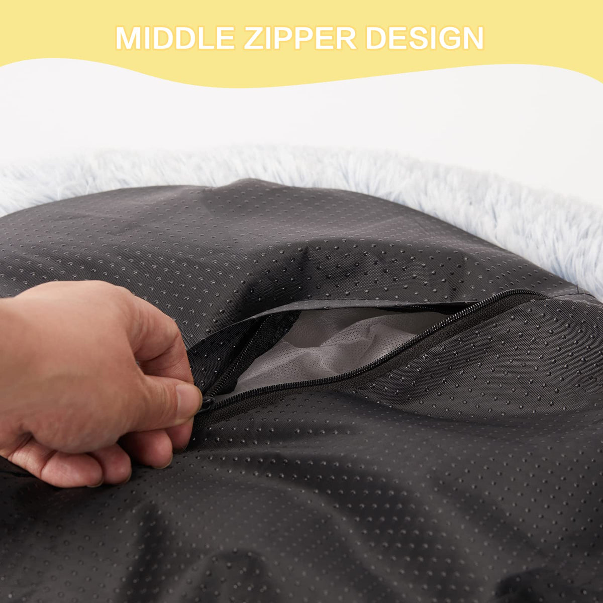 Q: Is the dog bed easy to clean?A: Yes, the Bedfolks Calming Donut Dog Bed comes with a removable cover that features a middle zipper for easy access. The cover is machine washable, allowing for convenient cleaning. Just tumble dry at a low temperature after washing.