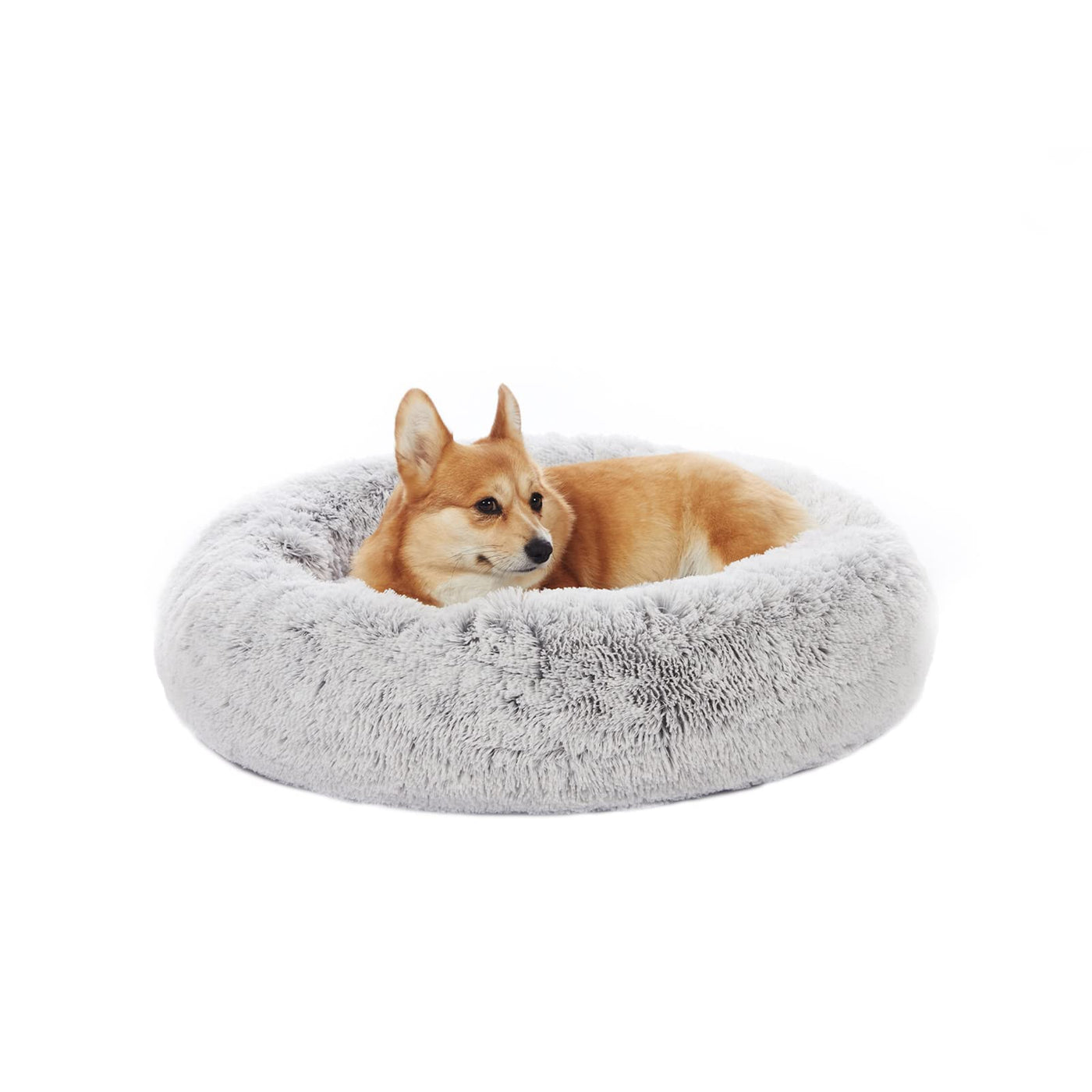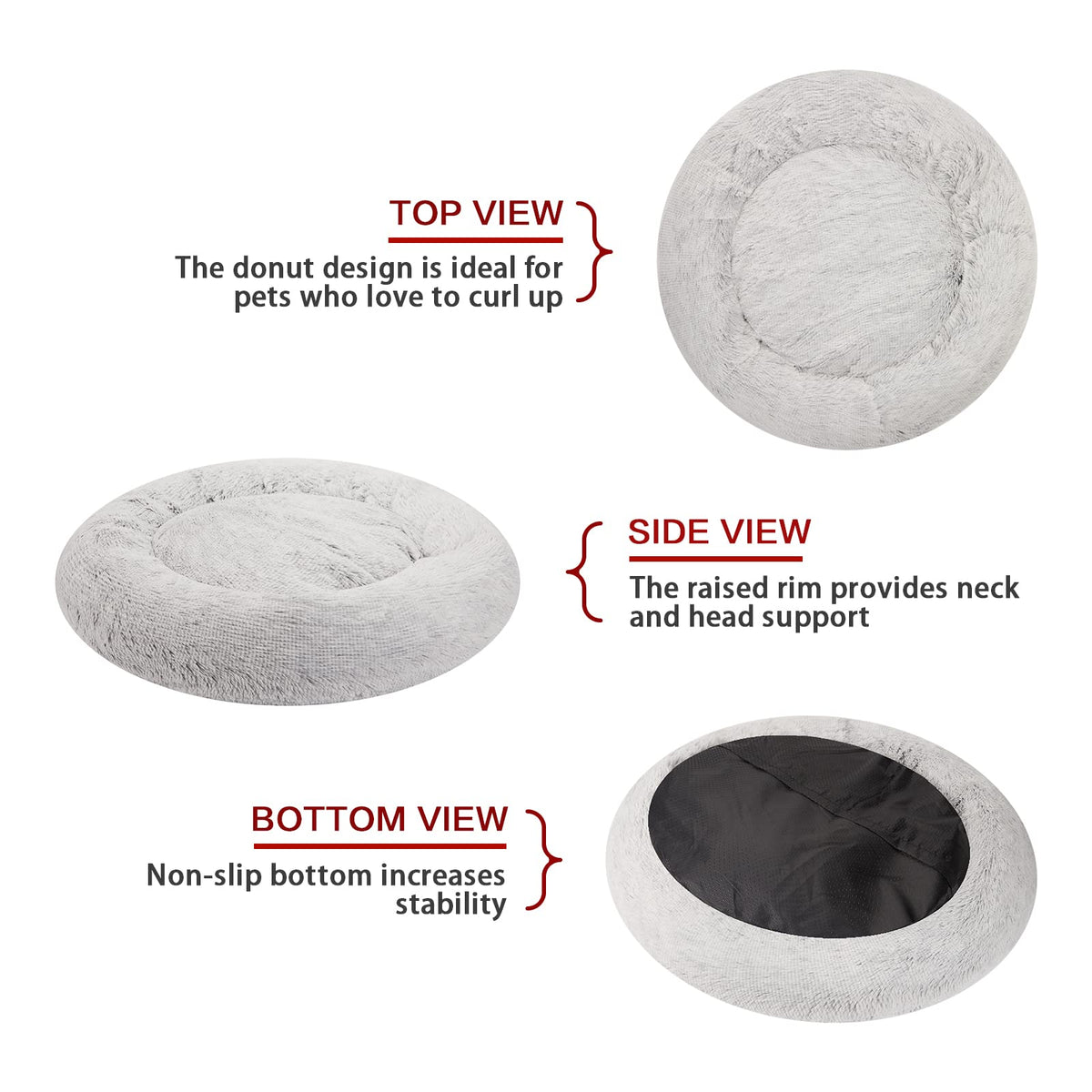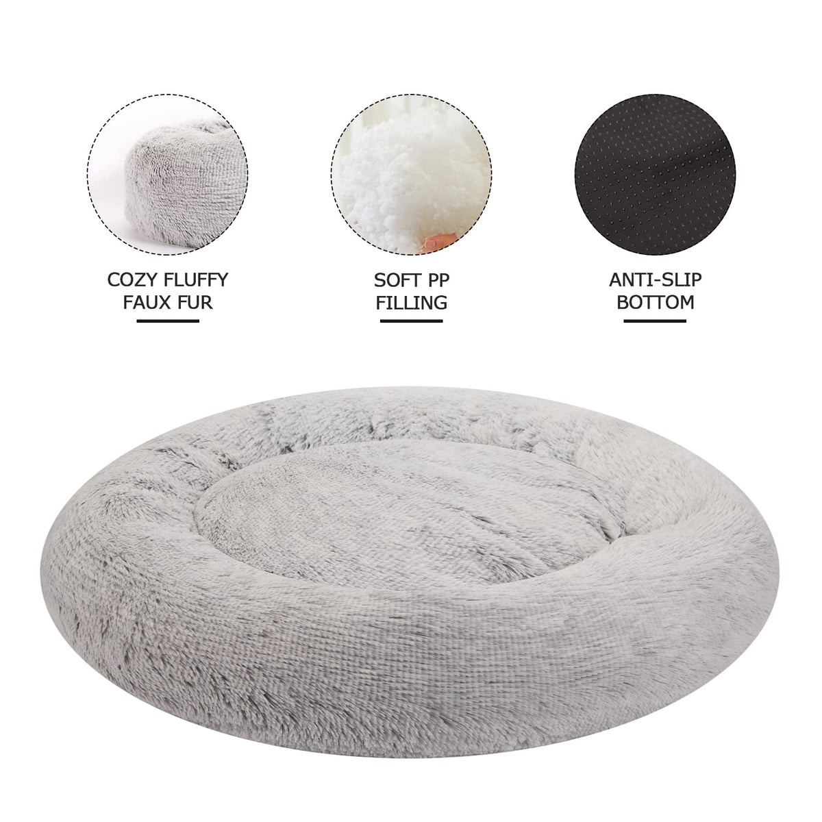 Calming Donut Pet Bed The cute circle dog bed is made of soft faux fur, very fluffy ,soft, and comfortable. The donut shape of the pet cushion is ideal for pets who love to curl up. The raised rim provides neck and head support and creates a sense of security, which helps your dog to relax the muscles. 3 Sizes for Different Breeds Small dog beds in Dia 23' are perfect for cats, puppies, rabbits, ferrets, and small dogs up to 25 lbs like Chihuahua, Pomeranian, Bichon, Shih Tzu, Teddy, Schnauzer, Yorkshire Terrier and so on. Medium dog bed in Dia 30' are appropriate for dogs up to 45lbs like Beagle, French Bulldog,Poodle,Dachshund. Large dog beds in Dia 36' are appropriate for dogs up to 100lbs like Labrador, The German shepherd, golden retriever, Great dane. It is recommended to measure your pet's size before purchase. Pretty Colors We have Pink, Brown, Light Grey, Dark Grey, Light Blue, and Navy Blue. Gradient colors are very attractive