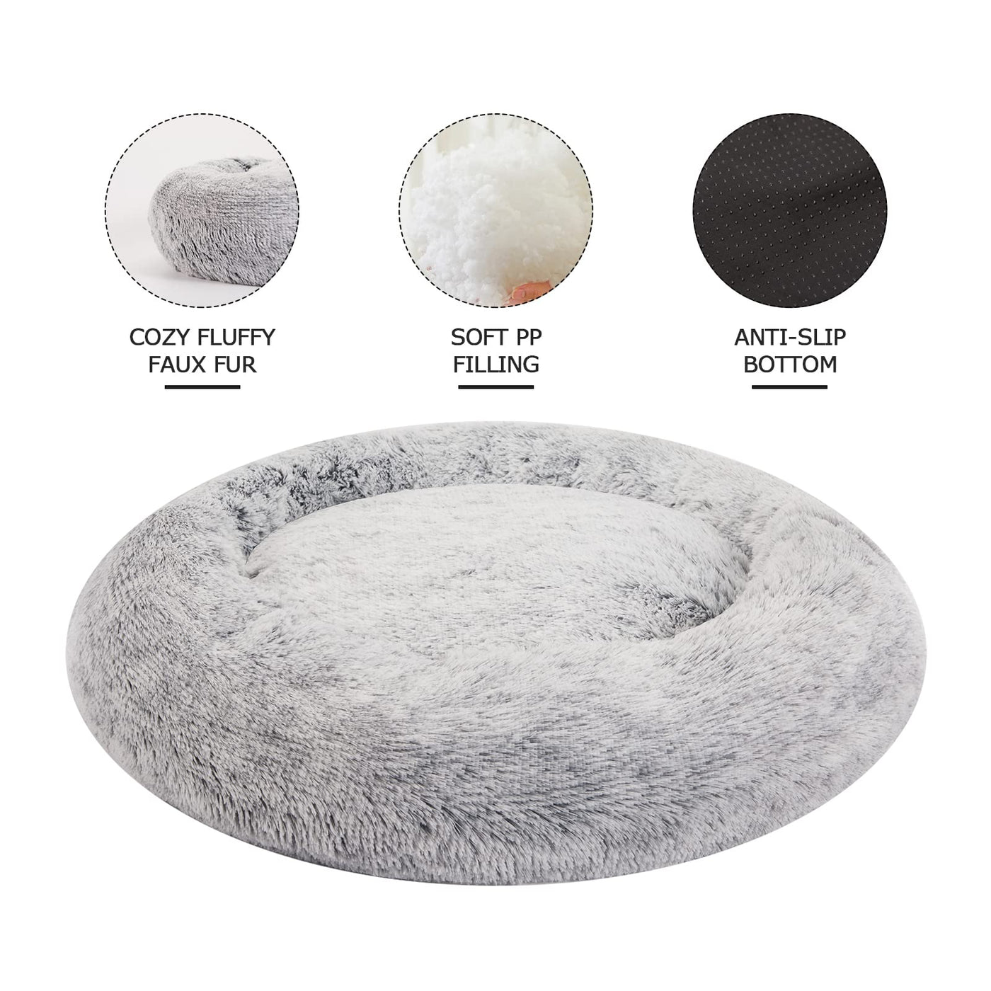 Calming Donut Pet Bed The cute circle dog bed is made of soft faux fur, very fluffy ,soft, and comfortable. The donut shape of the pet cushion is ideal for pets who love to curl up. The raised rim provides neck and head support and creates a sense of security, which helps your dog to relax the muscles.