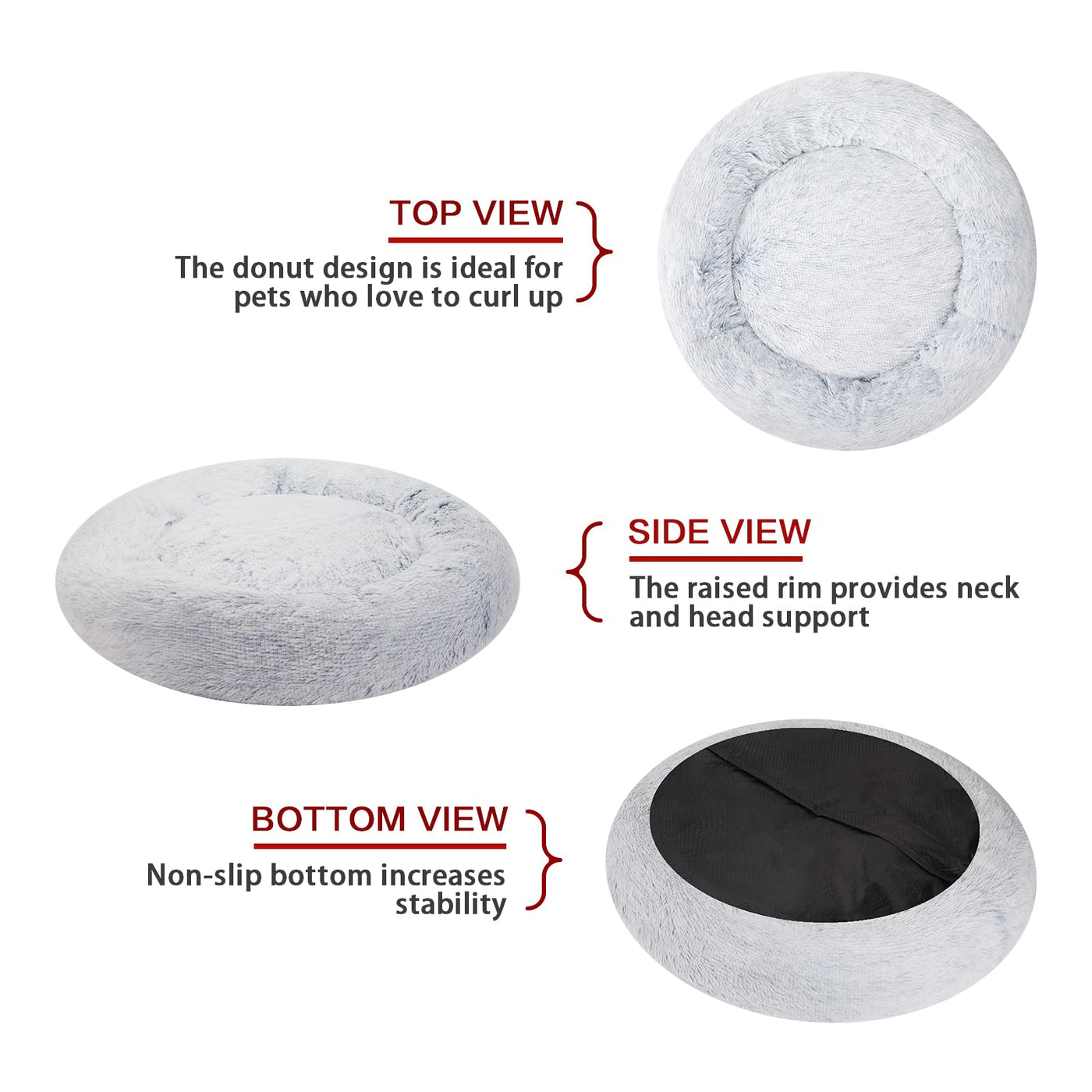 Calming Donut Pet Bed The Cute Circle Dog Bed Is Made Of Soft Faux Fur, Very Fluffy ,Soft, And Comfortable. The Donut Shape Of The Pet Cushion Is Ideal For Pets Who Love To Curl Up. The Raised Rim Provides Neck And Head Support And Creates A Sense Of Security, Which Helps Your Dog To Relax The Muscles. 3 Sizes For Different Breeds Small Dog/Cat Beds In Dia 23'' Are Perfect For Cats, Puppies, Rabbits, And Small Dogs Up To 25 Lbs Like Chihuahua, Pomeranian, Bichon, Shih Tzu, Teddy, Schnauzer, Yorkshire Terrier And So On. Medium Dog Bed In Dia 30'' Are Appropriate For Dogs Up To 45Lbs Like Beagle, French Bulldog, Poodle, Dachshund. Large Dog Beds In Dia 36'' Are Appropriate For Dogs Up To 100Lbs Like Labrador, The German Shepherd, Golden Retriever. Extra Large Dog Beds In Dia 45'' Are Appropriate For Dogs Up To 150Lbs Like Grate Danes, Huskies, Alaskan Malamutes. It Is Recommended To Measure Your Pet'S Size Before Purchase. Pretty Colors We Have Pink, Brown, Light Grey, Dark Grey, Light Blue, And Navy Blue. Gradient Colors Are Very Attractive