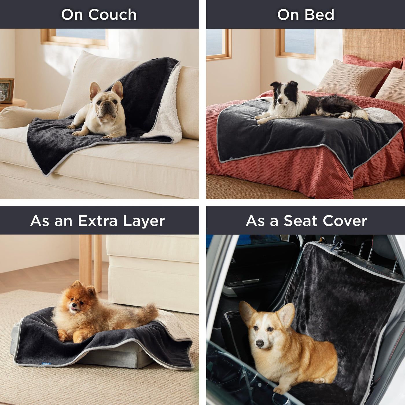 Warm & Cozy Blanket: Dog blanket is lined with warm Sherpa on one side and flannel fleece on the other. Waterproof pet blanket prevents humidity and cold keeping your cats and dogs comfortable and warm.