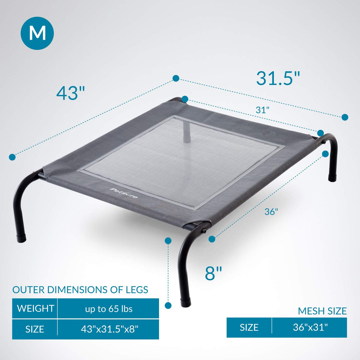 Q: What are the dimensions of the Bedsure Medium Elevated Cooling Outdoor Dog Bed?A: The Bedsure Medium Elevated Cooling Outdoor Dog Bed measures 43 inches in length and 31.5 inches in width, making it suitable for medium-sized dogs.