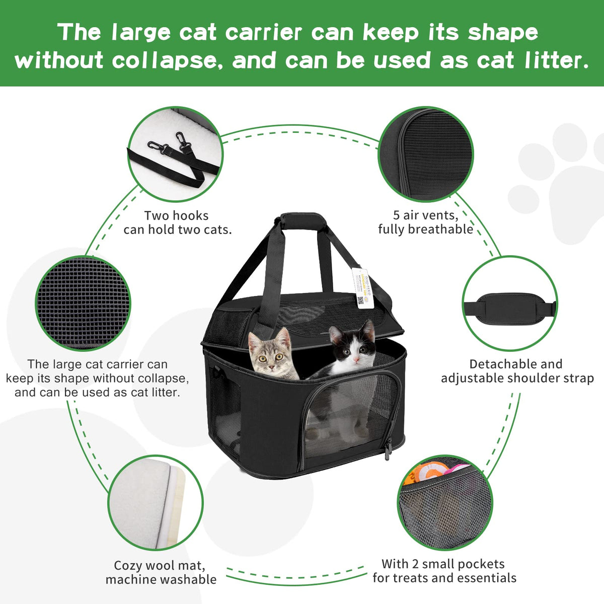 ???CARRIER SIZE? Length: 17” Width: 11.8” Height: 13”. The cat carrier is designed for higher height, the wider width, the more space for your lovely pets. So that our large pet carrier is fit for one medium cat, two small kittens, one or two small doggies. The maximum weight is 20 lbs. Please do measurement before you add to your cart. | ???OEKO-TEX STANDARD 100 CERTIFIED?Our soft sided cat carrier are all gained the ‘’OEKO-TEX STANDARD 100’’ certification, which means our large cat carrier is non-smelly, mild, non-stimulating, and friendly to your lovely cats & dogs. It’s our honor and duty to provide the best products to you and your pets. | ???CUSTOMIZED DESIGN & DURABLE?In order to make our pets have a more comfortable environment, we design the soft-sided cat carrier to be higher, and at the same time have side ventilation windows to make the ventilation inside the travel cat carrier better. Your pets will have enough space to lay down, stand up, switch positions, and feel less trapped. When you are not using the carrier, the whole thing folds down to save space. | ???FULLY FUNCTIONAL?The mesh-paneled and transparent window carrier provides good ventilation and offers a chance for you to see your pet to make sure everything is okay. Contains a removable plush bed to provide comfort for your companion. Equipped with adjustable shoulder straps, a safety harness, and a locking zipper to keep your pup safe. | ???AIRLINE APPROVED CARRIER? With an airline-approved design, you can take your pet to go to everywhere. It has a side strap that you can swipe over a rolling suitcase handle for securing the cat carrier. The pet backpack carrier provides more outdoor possibilities, such as traveling, riding, walking, camping, hiking, and more outdoor activities.