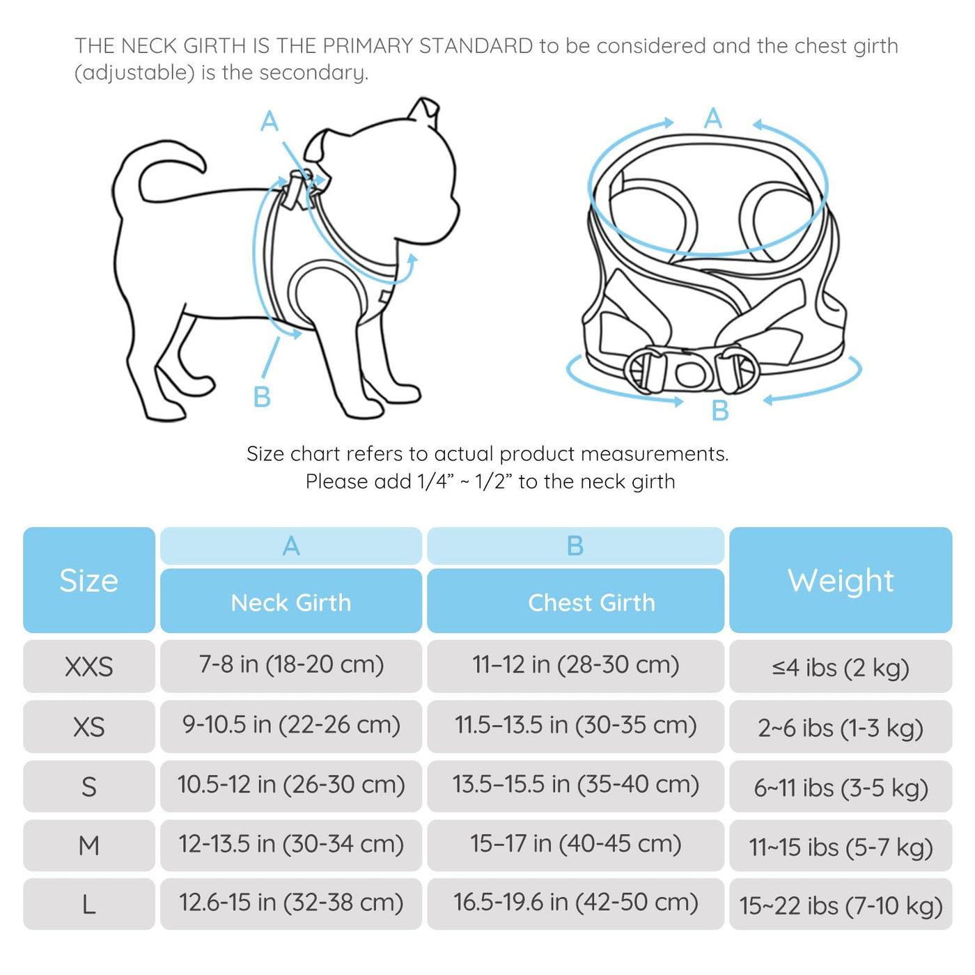 ?Suitable Size?Please measure your puppy 's neck girth and chest girth don 't choose size by weigh only then refer to the sizing chart. If your puppy 's neck girth or chest girth is between two sizes it is recommended that choose the larger size.
