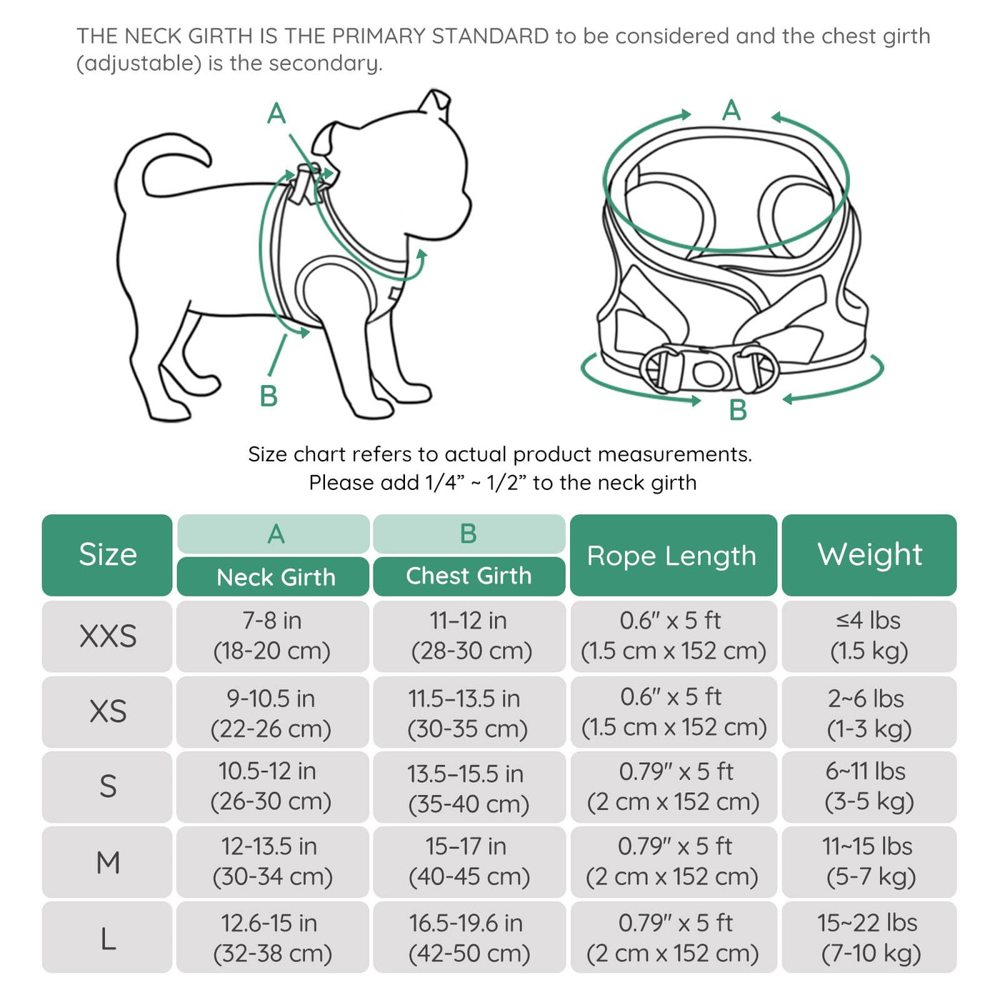 Suitable Sizelease measure your puppys neck girth and chest girth dont choose size by weigh only then refer to the sizing chart If your puppys neck girth or chest girth is between two sizes it is recommended that choose the larger size Step In Design for Easy on and OffOur Step in vest harness design makes it easy to use Small dog harness with magic tape strong buckle with safety lock and double D rings ensure no accidental detachment Breathable Air MeshThe puppy harness are made with soft mesh fabric itAs lightweight but sturdy easy to clean and quick-dry The step in harness design make the pulling pressure distributed to the body to prevent choking Safe and comfortable HarnessWith reflective strip design the dog harness strip provides extra visibility and safety for day or night walking The leash also has reflective strip more safety uaranteeWe promise to provide good customer service If you have any questions about our dog harness please feel free to contact us our customer service staff will reply you within 24 hours