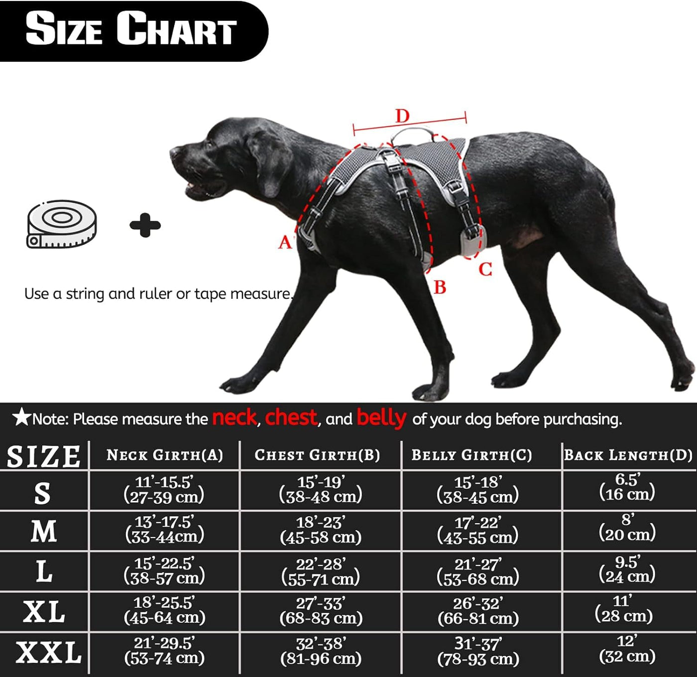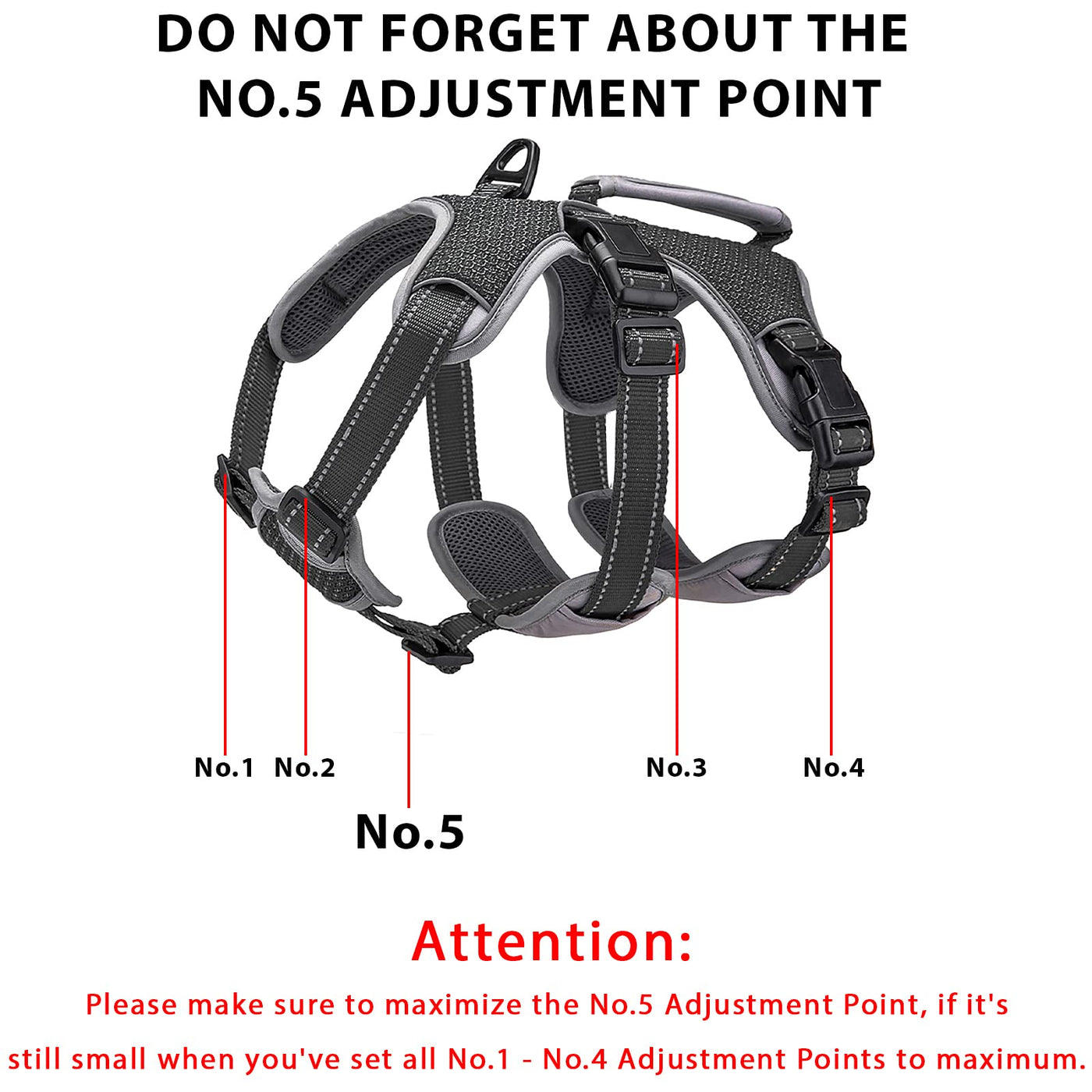 ?5 POINTS OF ADJUSTMENT?- No pull dog harness has 5 convenient points of adjustment for full range of motion. All the straps are adjustable easy to put on and take off. MEASURE and refer to our sizing chart to find the best fit before ordering.