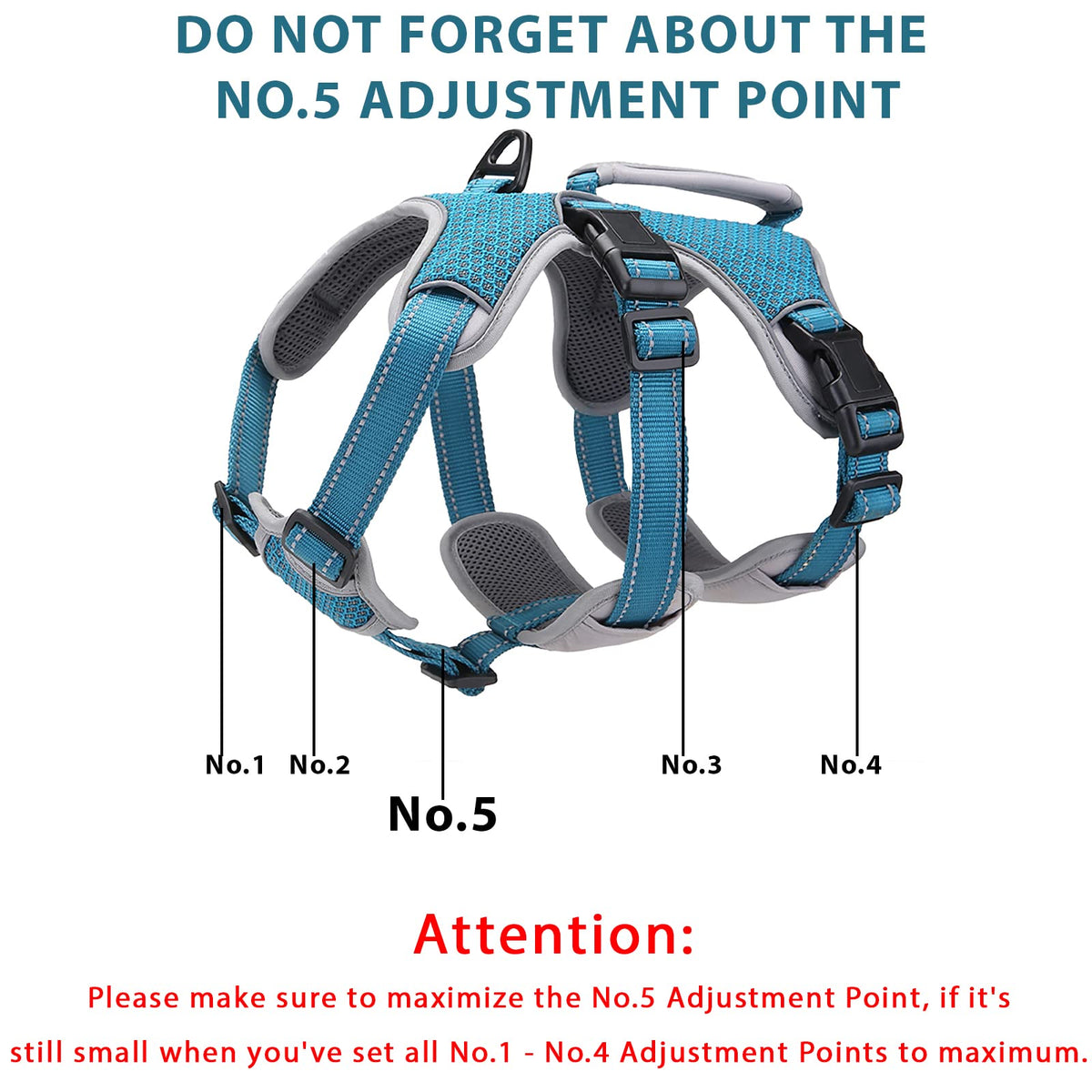 ?5 POINTS OF ADJUSTMENT?- No pull dog harness has 5 convenient points of adjustment for full range of motion. All the straps are adjustable easy to put on and take off. MEASURE and refer to our sizing chart to find the best fit before ordering.