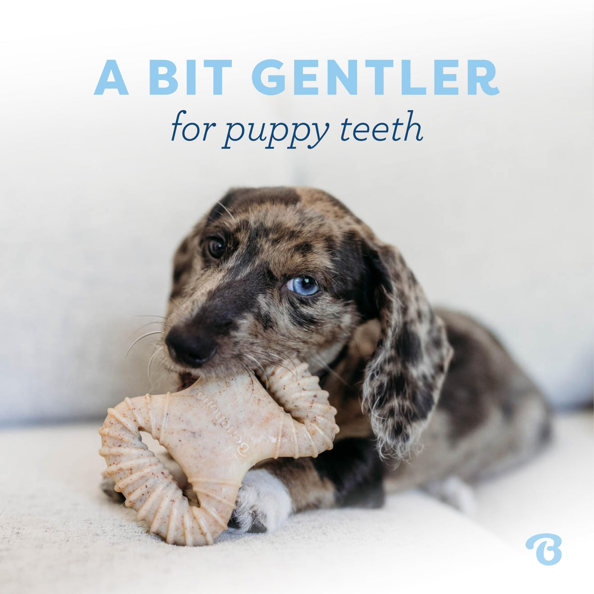 Q: What makes the Benebone Puppy Dental Chew different from other dog chew toys?A: The Benebone Puppy Dental Chew is designed specifically for puppies with a focus on real flavor and durability. Unlike traditional rubber toys, our chews are made with 100% real bacon, enhancing the taste that puppies love. Additionally, the unique wishbone shape provides a paw-friendly grip, making it easier for puppies to hold and chew.