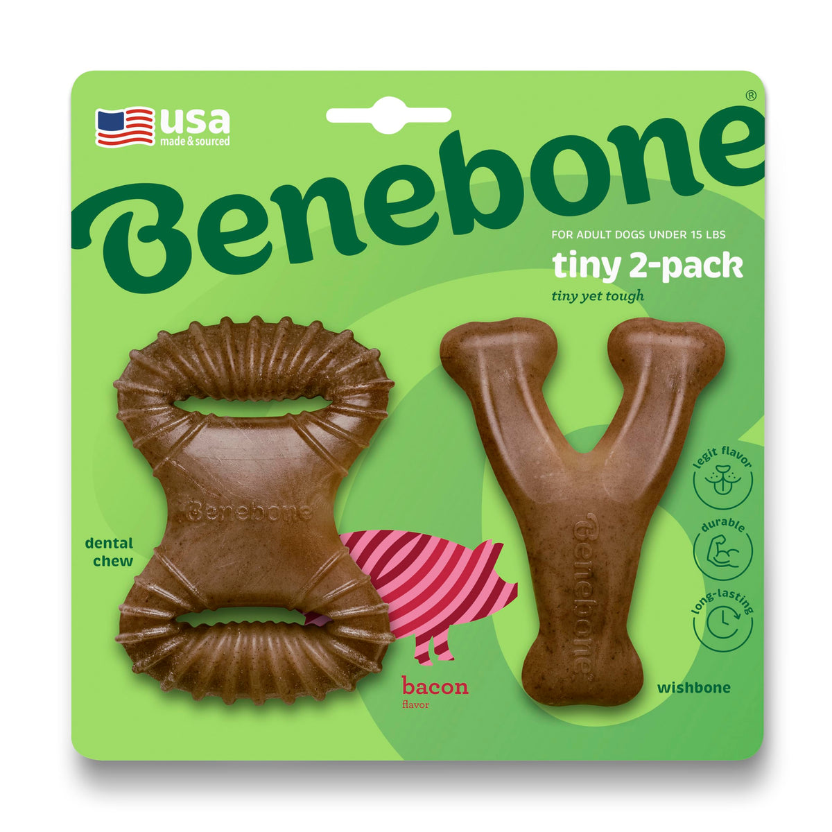 The Benebone Tiny Dental Chew/WishboneLittle dogs love to chew just like the big guys. And they dig real bacon.About BeneboneAt Benebone, we started with the premise that dogs experience scent and flavor in a way we can’t even grasp. So we ditched the neon colors and loud squeaks. Inspired by a dog’s powerful sense of smell, we developed long-lasting durable chews that are jam-packed with real bacon. Once your tiny dog takes a bite of our USA-made chews, he’ll be hooked.We’re Obsessed with Safety TooWonder if Benebone is right for your dog? Here’s what you need to know. Since it’s hard, it’s important that your pup has strong teeth. If you’re unsure, check with your vet. Nobody likes an unexpected trip to the dentist. Keep an eye out for wear and tear. Within a month or so, we find that most dogs chew Benebone into submission. See the wear page on our website for helpful photos to determine when to replace yours. Keep away from households with peanut or other allergies.What’s Inside?Nothing but Nylon and Real Bacon for Tantalizing Flavor