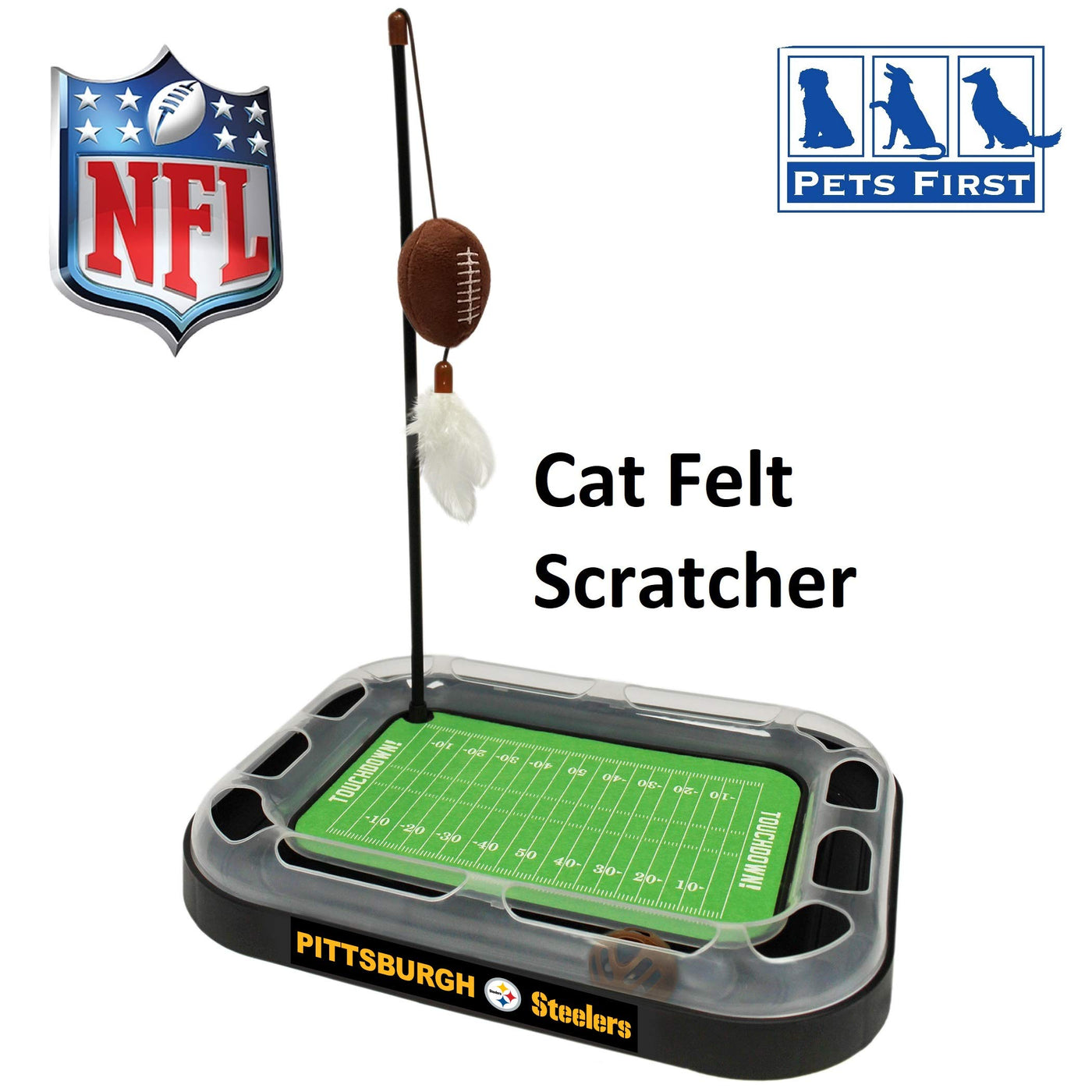 Q: What makes the Pets First NFL Pittsburgh Steelers Football Field Cat Scratcher Toy unique?A: The Pets First NFL Pittsburgh Steelers Football Field Cat Scratcher Toy is unique due to its combination of a football-themed scratcher and interactive features. It includes a refillable catnip plush football, a jingle bell cat ball, and vibrant team artwork, providing endless entertainment for both cats and football fans.