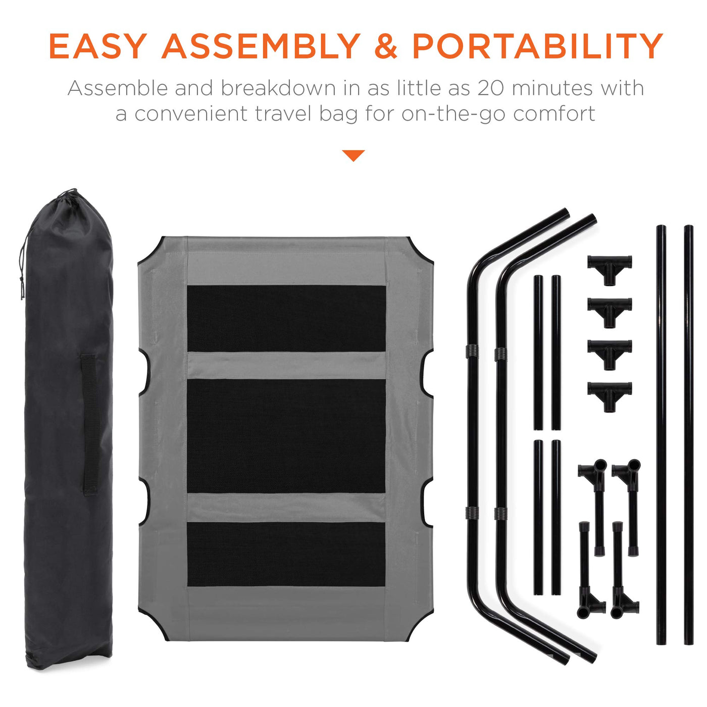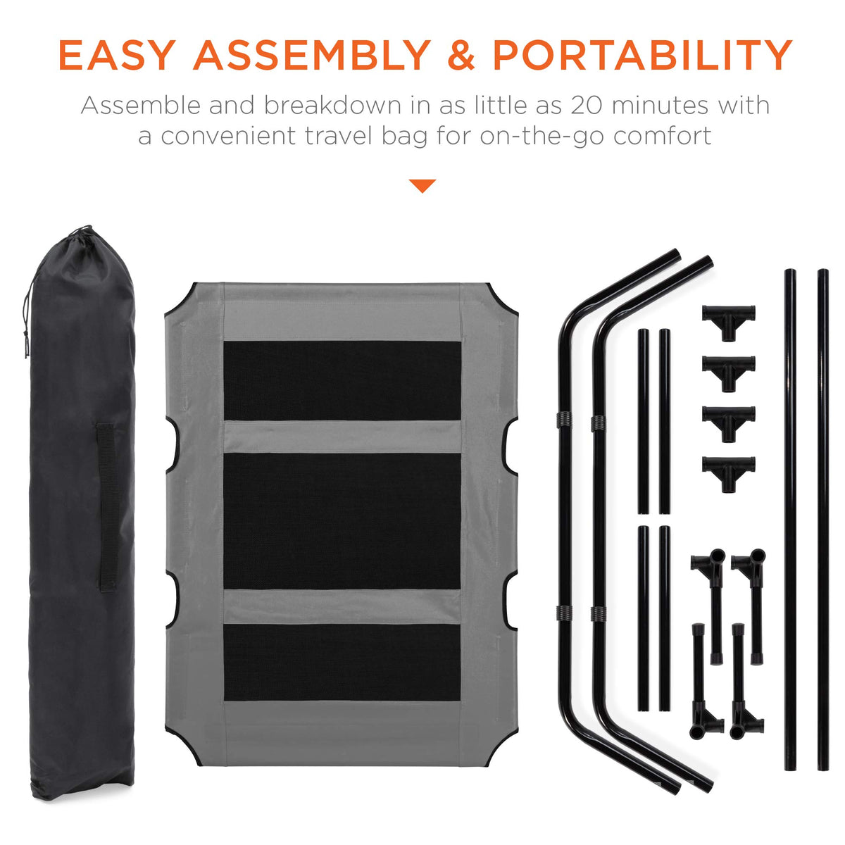Q: Is the dog bed easy to assemble and disassemble?A: Yes, the dog bed is designed for easy assembly and can be set up in as little as 20 minutes. It can also be quickly disassembled and stored in the included carrying bag for convenience.